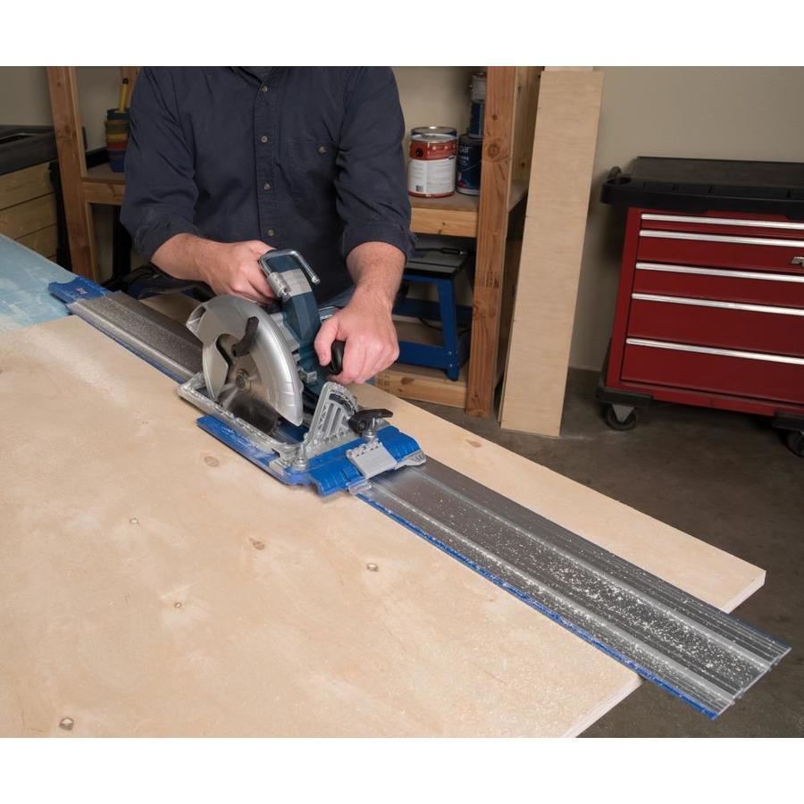 Rips, crosscuts, and makes angled cuts up to 48-in Universal saw plate accepts most circular saws—left or right blade Starting block supports saw at beginning of cut Two-piece precision saw track (26.5 In. each, 53 In. total) Durable anti-slip/anti-chip strips hold track in place, prevent splintering Simple one-time setup Saw can be removed and reinstalled quickly and easily Optional clamps for use on bowed, rough, or dirty plywood