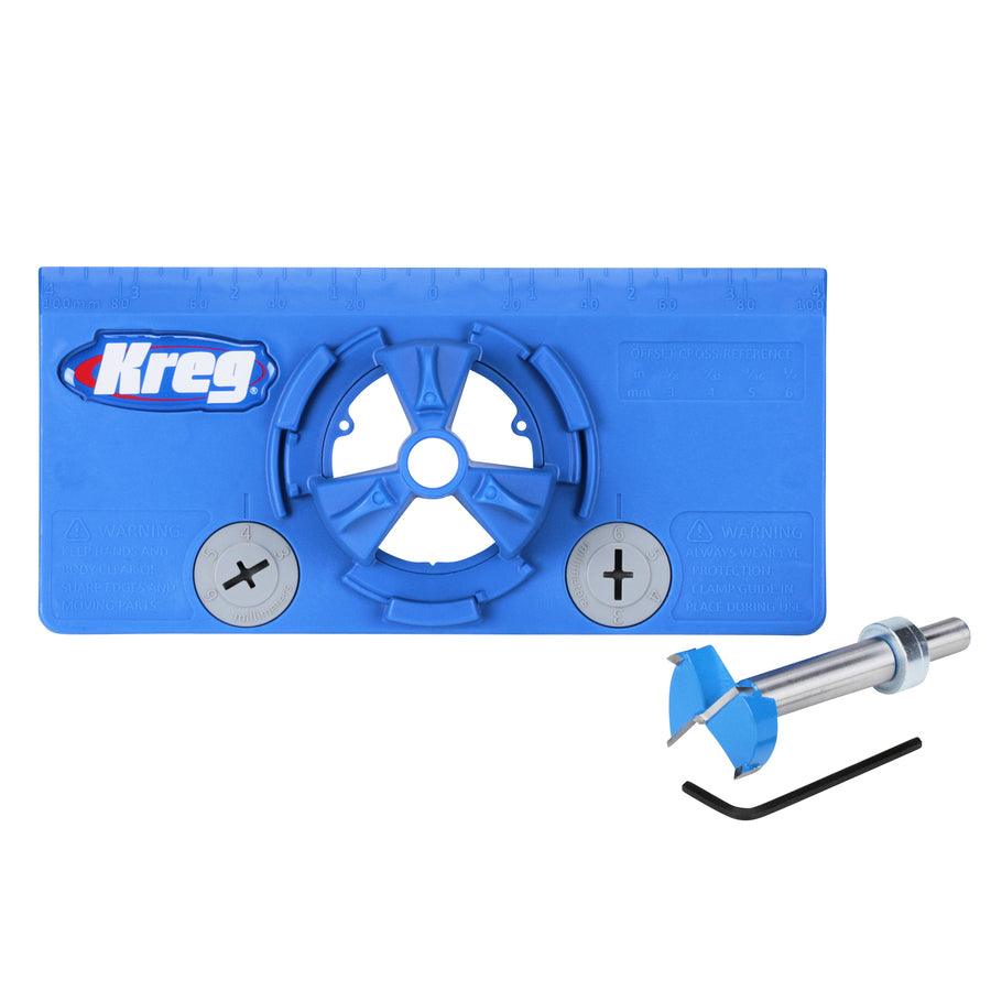 Accurate hinge positioning with built-in indexing tabs Repeatable results with built-in measuring scales Reliable drilling with bit guide and stop collar Simple to use with any drill—no special tools needed Adjustable cams ensure proper hinge offset Durable carbide-tipped drill bit included Strong, lightweight materials for easy handling