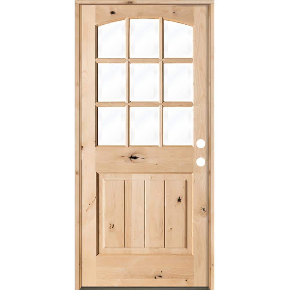 36 in. x 80 in. Krosswood Doors Knotty Alder Left-Hand/Inswing 9-Lite Arch Top V-Panel Clear Glass Unfinished Wood Prehung Front Door