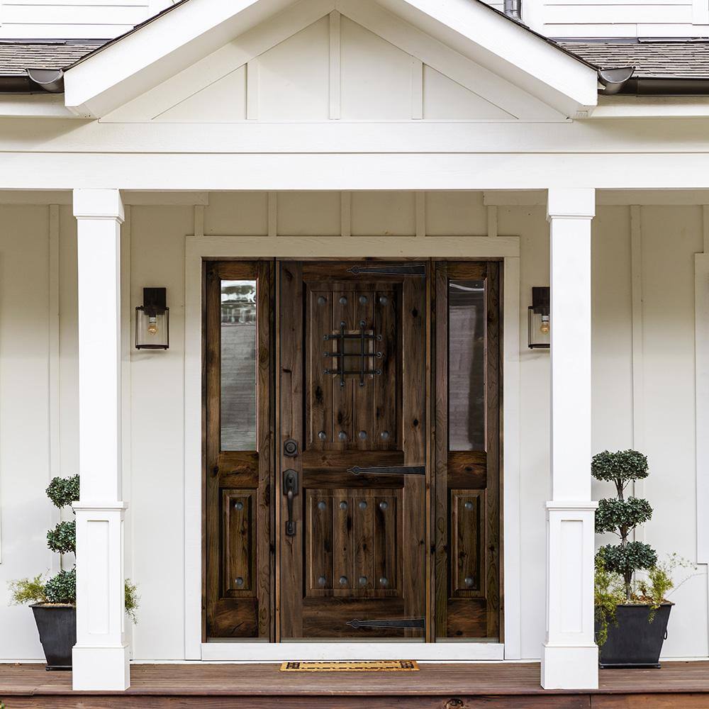 A statement-making knotty alder entry door with clear Low‑E insulated glass and dual half sidelites. Prehung, unfinished, and right-hand inswing, it features decorative clavos, strap hinges, and a functional speakeasy window for old-world charm with modern efficiency.