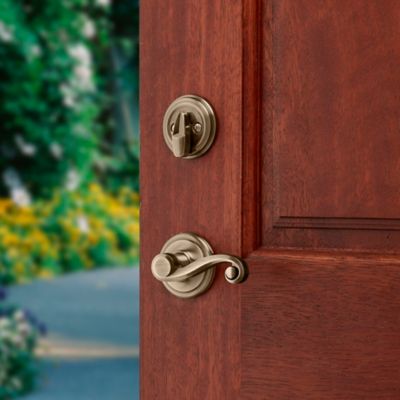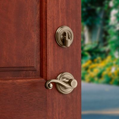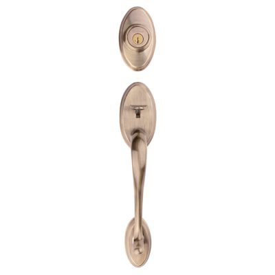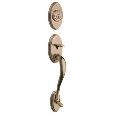 A Signature Series entry handleset featuring SmartKey Security for fast DIY re-keying and enhanced protection. The Shelburne design in Antique Brass includes a Grade 1 deadbolt and a Lido interior lever for elegant, dependable front door security.