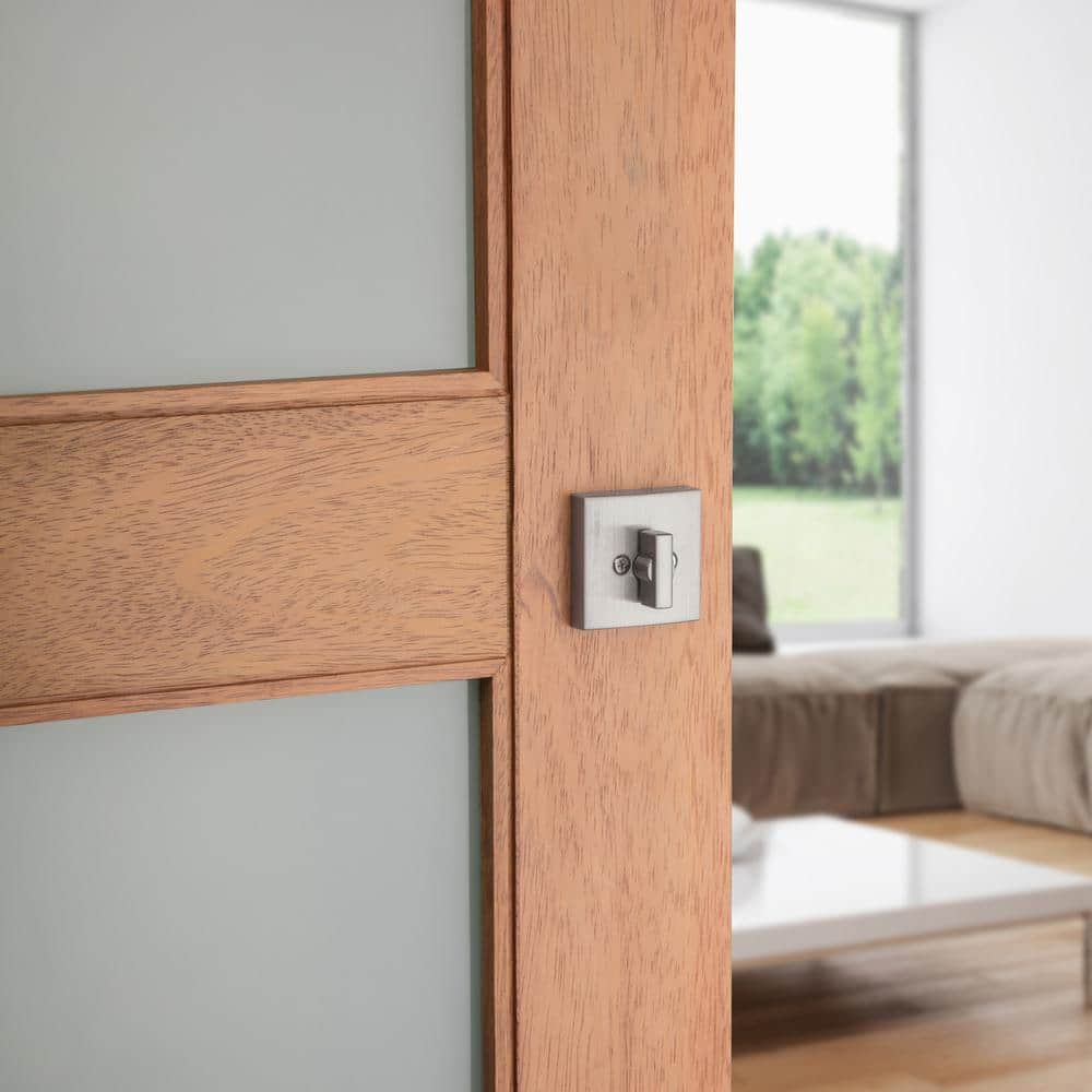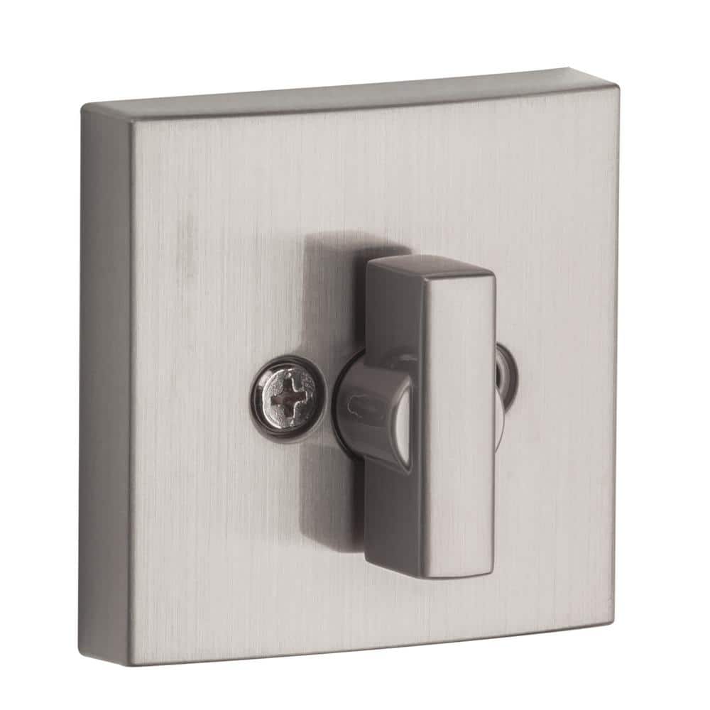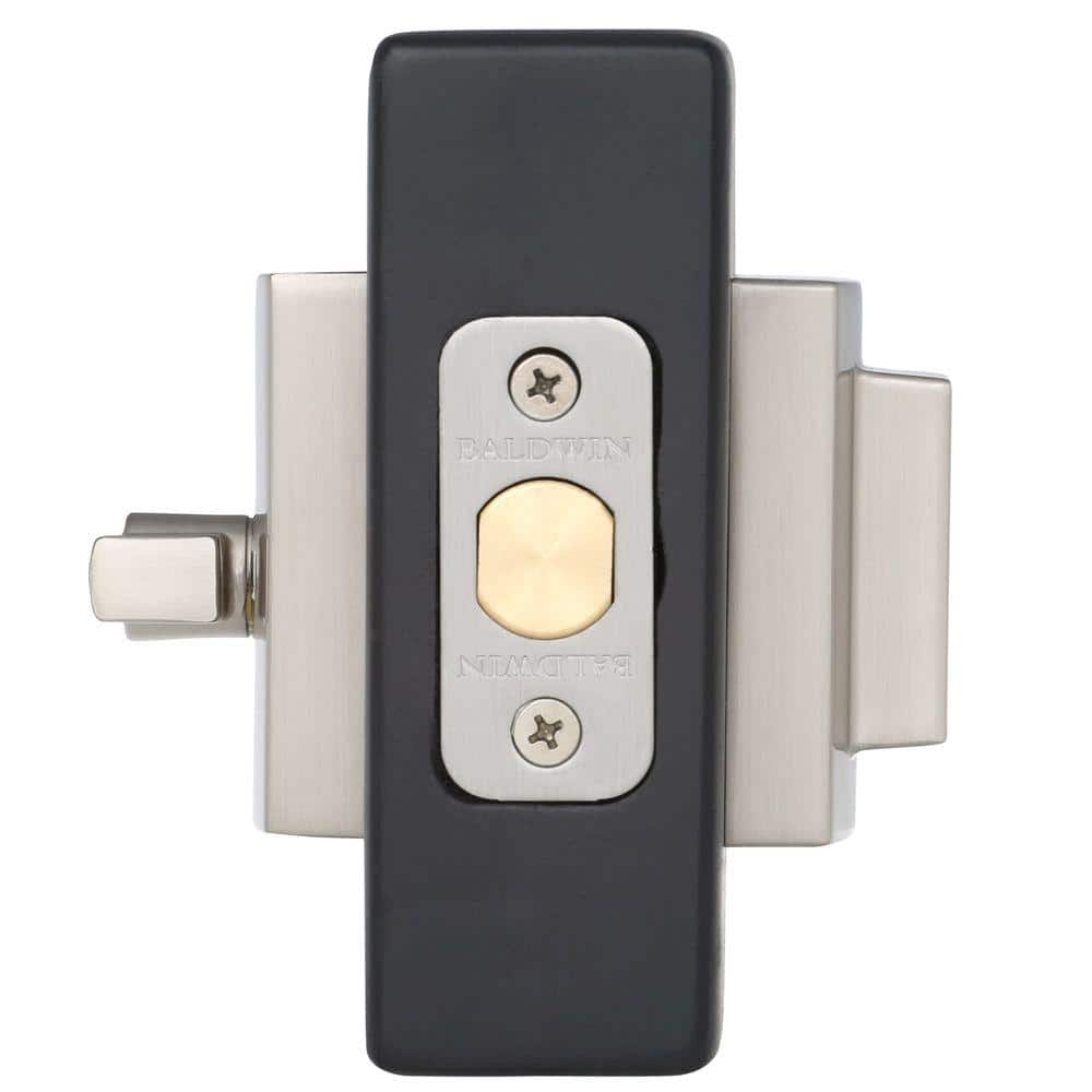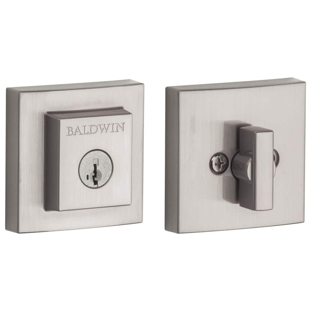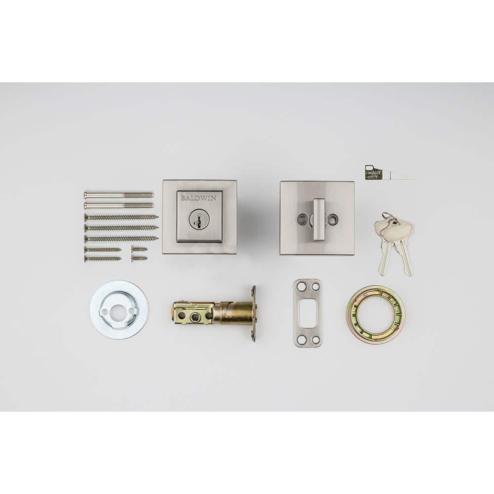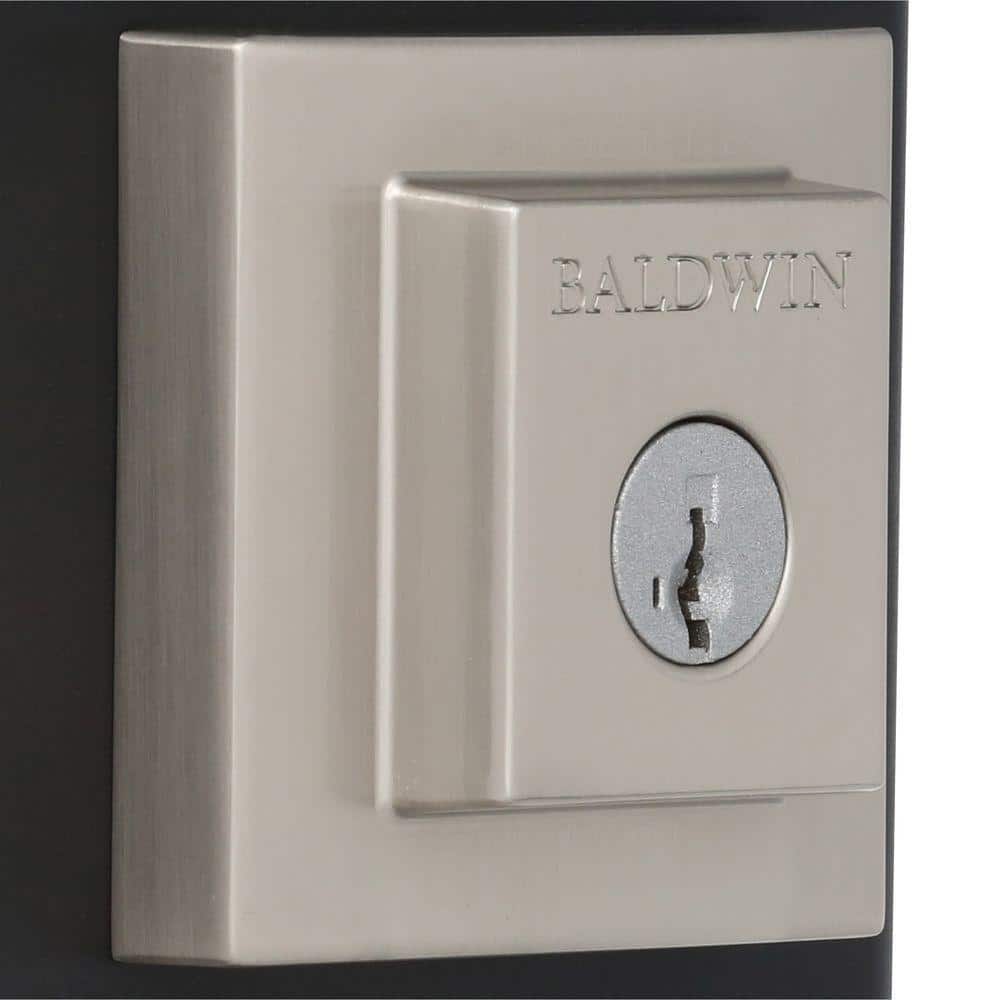 Secure exterior doors with the Baldwin Prestige Spyglass deadbolt, featuring a contemporary square design in satin nickel. SmartKey Security lets you re-key the lock yourself in seconds and the adjustable latch fits standard door preps for easy installation.