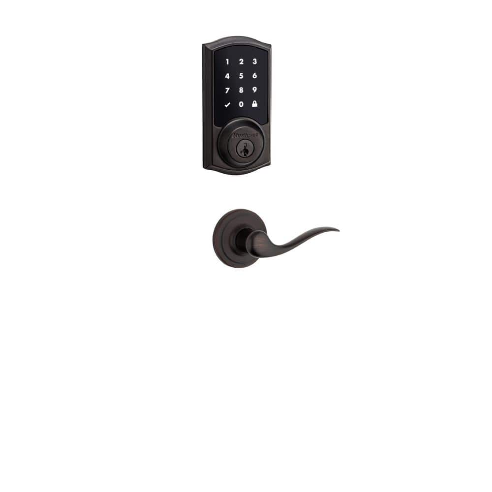 A HomeKit-enabled touchscreen smart lock for secure, keyless entry. This single-cylinder electronic deadbolt in Venetian Bronze includes the Tustin hall/closet lever and features SmartKey Security, SecureScreen technology, and easy app control via iOS.