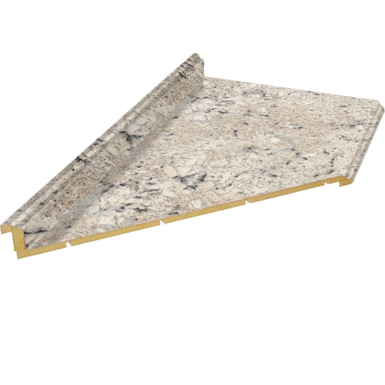 A durable, budget-friendly laminate countertop in Formica’s Ouro Romano Etchings finish with the Barcelona double-waterfall edge and integrated backsplash. Pre-cut at 45° for corner installations, it resists stains, scratches, and scuffs for long-lasting performance in kitchens, laundry rooms, and workspaces.