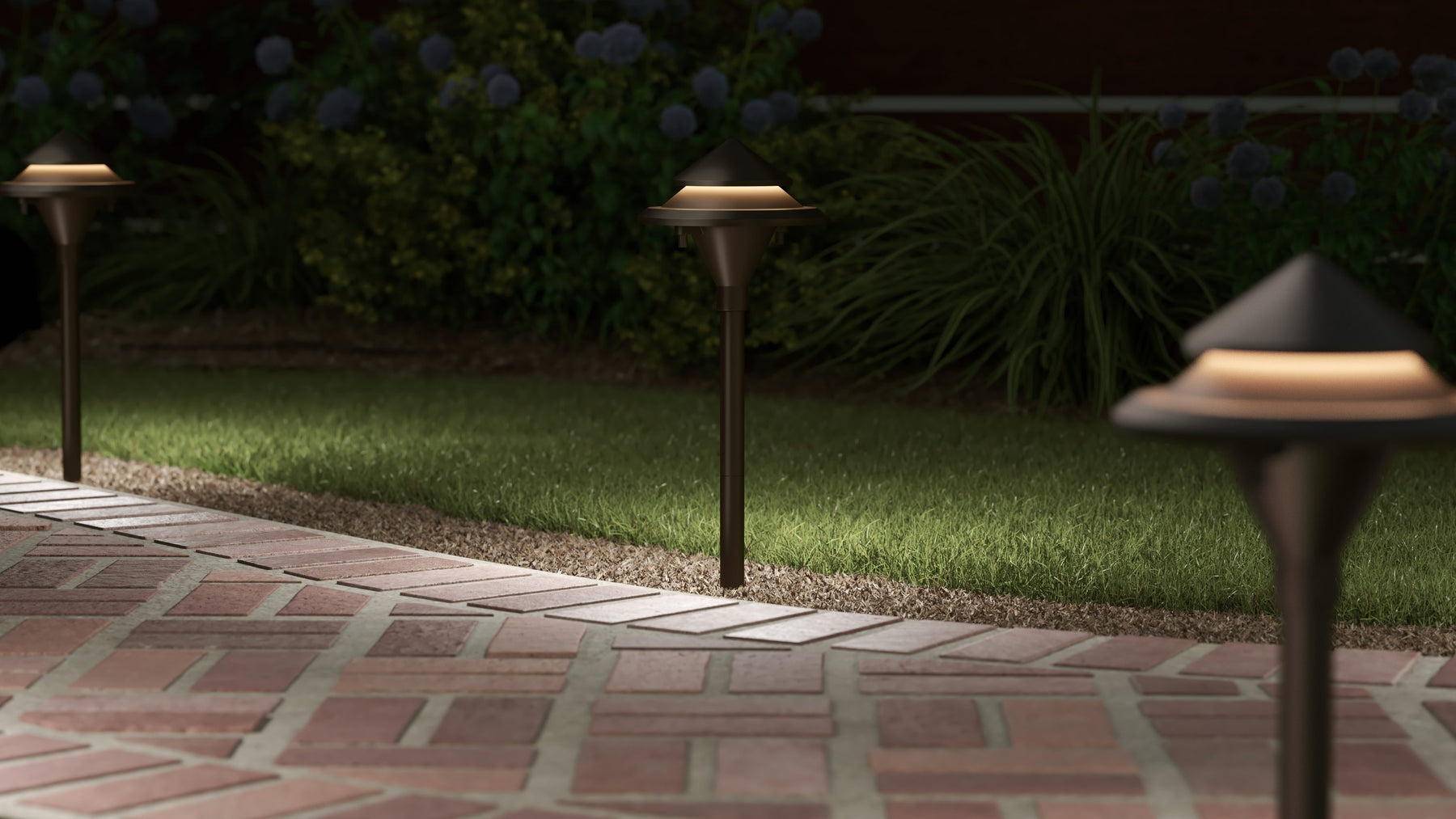 This Kichler path light brings a sophisticated, layered silhouette that casts a soft, concentric glow across garden beds and walkways. The Olde Bronze finish feels timeless, pairing beautifully with stone, brick, and lush greenery. Cluster several along a curve to create a rhythmic light trail that guides and enchants. It’s a small luxury that elevates evening ambiance with effortless elegance.