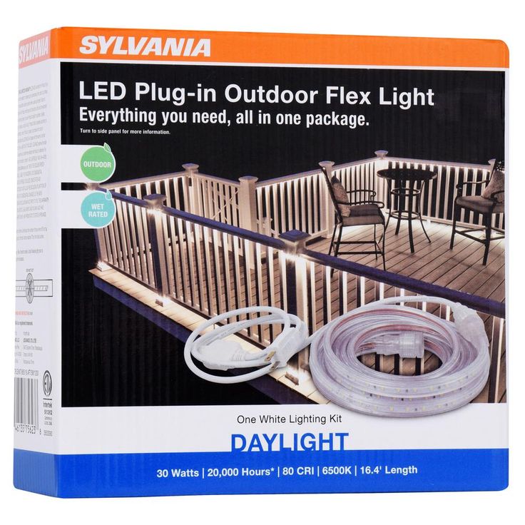 Sylvania LED Plug-In Outdoor Flex Light offers a complete solution for your lighting needs. Suitable for outdoor use year-round. The kit includes strip, AC power cord, clips and screws as well as a full guide to installation. Low power usage.
