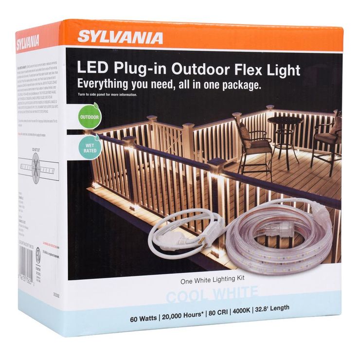 Sylvania LED Plug-In Outdoor Flex Light offers a complete solution for your lighting needs. Suitable for outdoor use year-round. The kit includes strip, AC power cord, clips and screws as well as a full guide to installation. Long Life: Up to 20,000 hours.