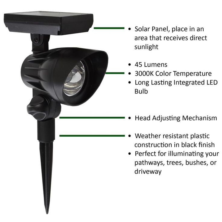 Use for enhancing your home, adding charm and elegance and increasing your safety in evening settings. This Solar LED Spotlight will create the perfect lighting accent wherever it is placed. Highlight features of your landscape with the 45 Lumens of LED light. Solar means you can use it anywhere the sun shines on the solar panel.