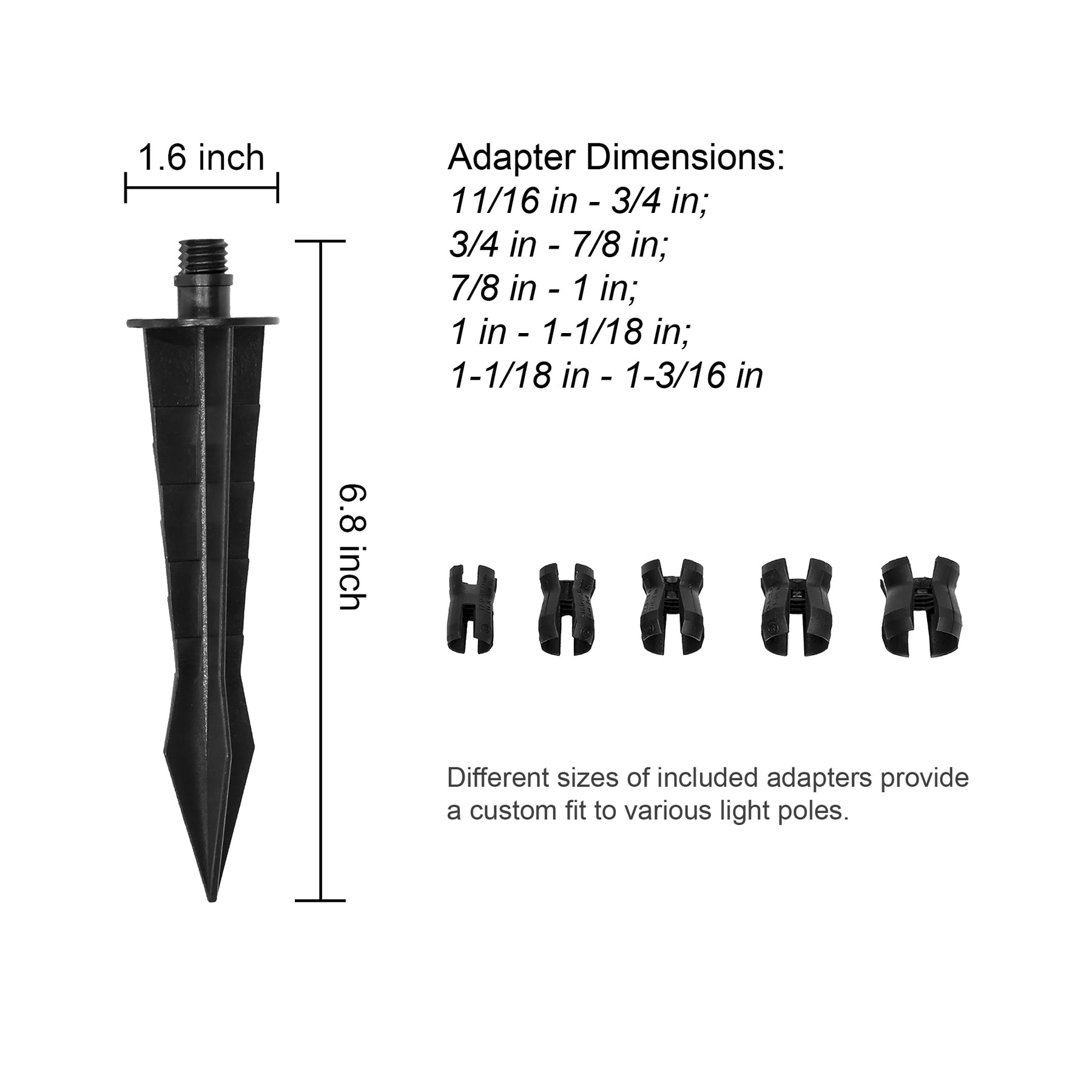 • Universal Fit Adapters: Five included adapters accommodate 11/16 in to 1-3/16 in pole sizes for most solar landscape lights