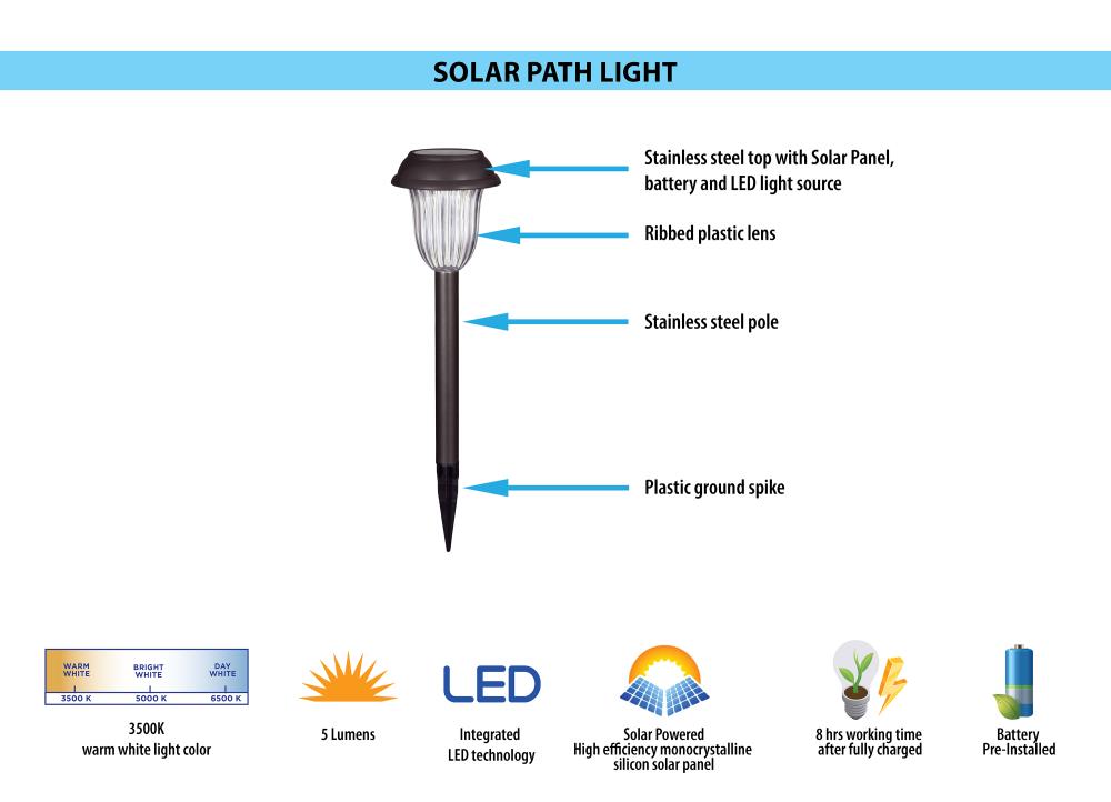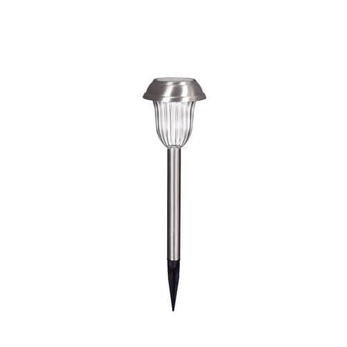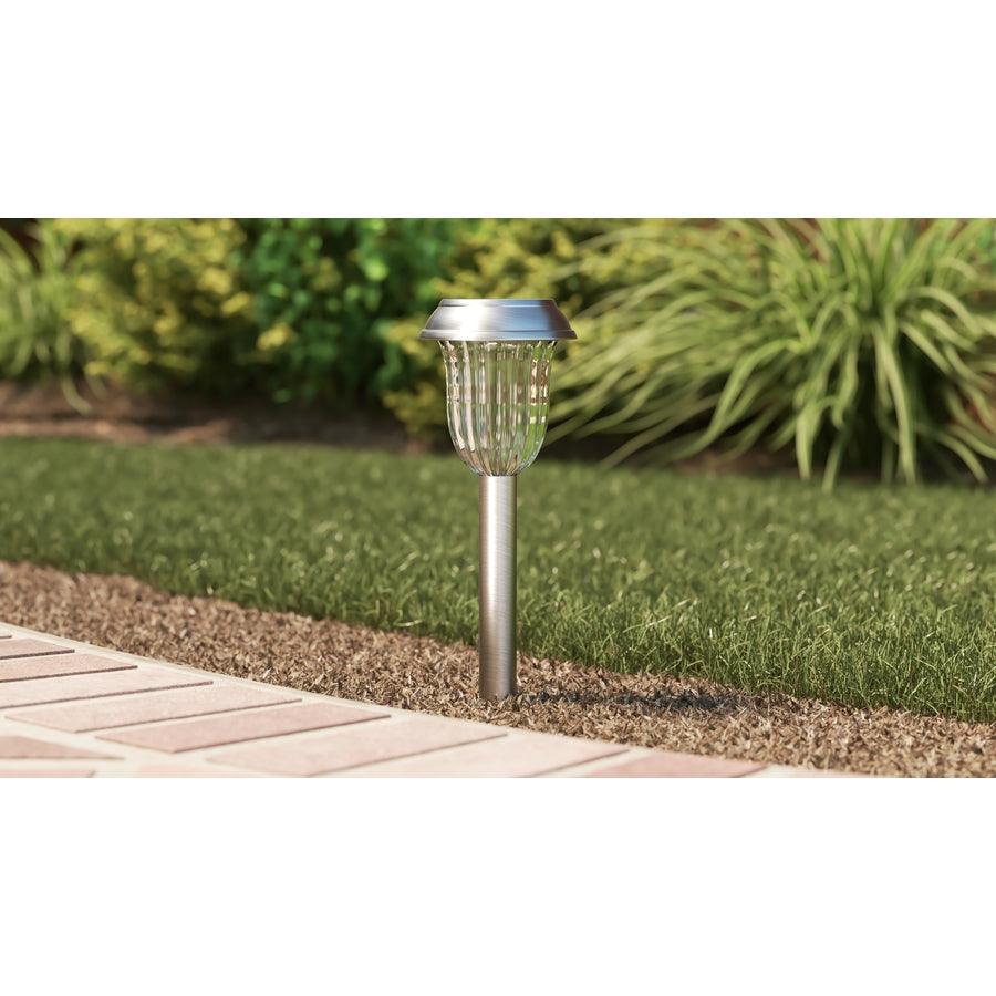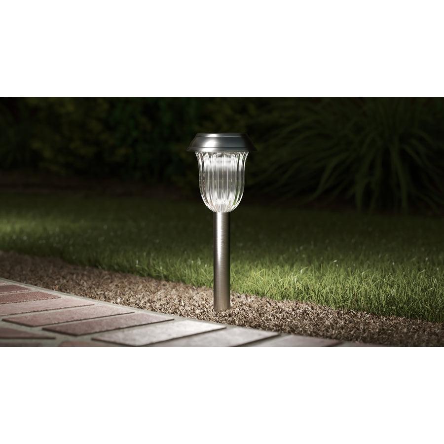 Compact, stainless steel solar path light delivers warm white illumination along walkways and gardens. Integrated LED, ribbed clear lens, and dusk-to-dawn operation provide effortless, energy-free lighting for up to 8 hours after a sunny day.