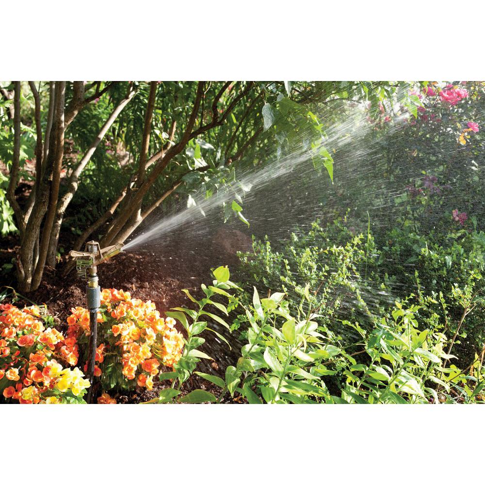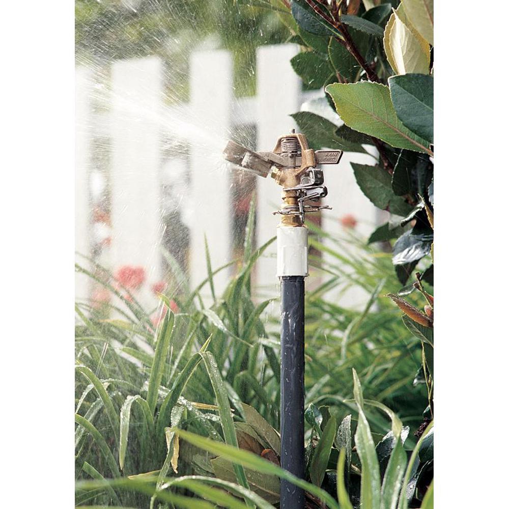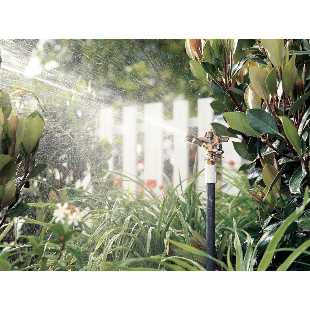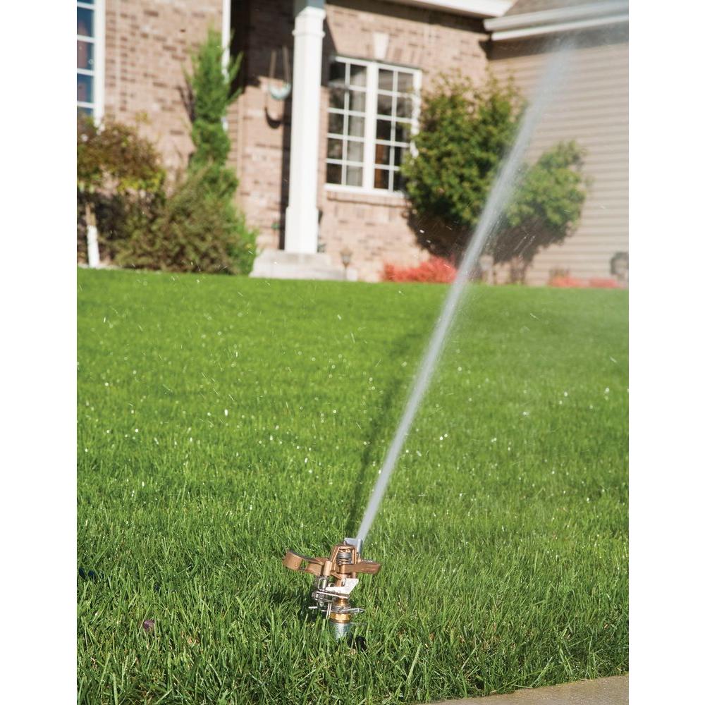 This deluxe riser-connected impact sprinkler, made out of durable all-metal materials, offers effortless adjustments for spray distance and arc. The 25-PJDA-C, the top-selling brass impact sprinkler, is a modern take on Rain Bird's original impulse sprinkler that was patented back in 1933. It boasts a straight-through flow design, ensuring exceptional performance even with dirty and reclaimed water. Suitable for medium to large lawn areas, gardens, and landscaping, this traditional favorite has a classic impact sound. The adjustable deflector flap allows for a customizable stream length from 20-ft. (6 m) to 41-ft. (12.5 m) radius, while the diffuser screw breaks up water into smaller droplets for more consistent watering. The die-cast, white bronze PJTM spray arm effectively controls the stream and prevents side splash onto buildings and walkways. With its rugged all-metal construction, this impact sprinkler is designed to last.