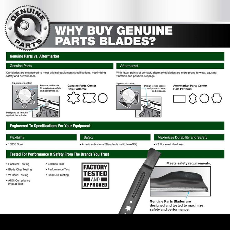 Use the Parts your machine was born with, use the OEM factory blade. These blades have been specifically designed by the manufacturer to keep your machine running at its peak level. OEM blades offer the premium cutting benefits and safety as the blades that were installed at the factory.