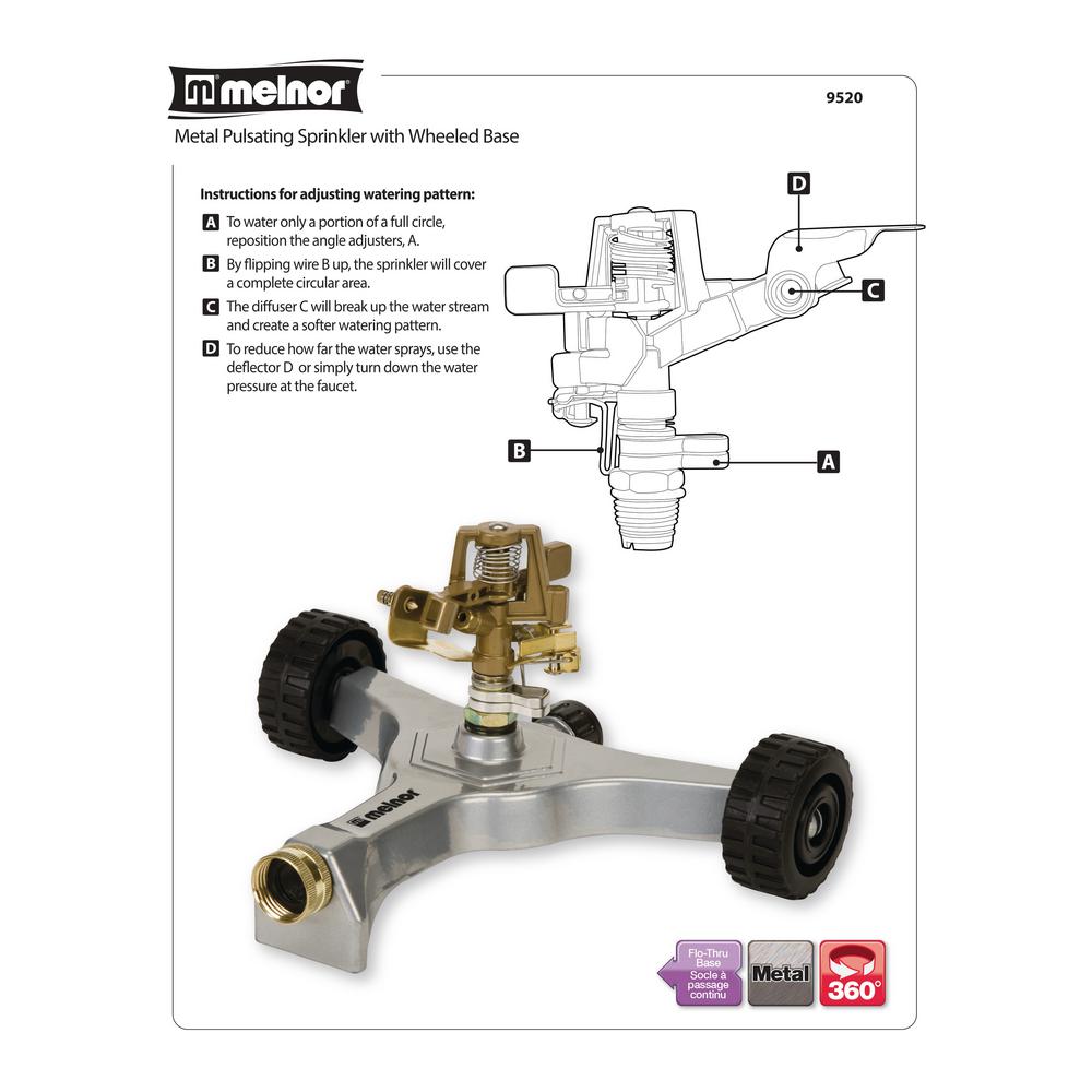 Easy to use and durable, this pulsating sprinkler is ideal for watering medium sized lawn areas. The wheeled base makes moving to the next area easy while the pulsating action promotes healthy lawn growth.