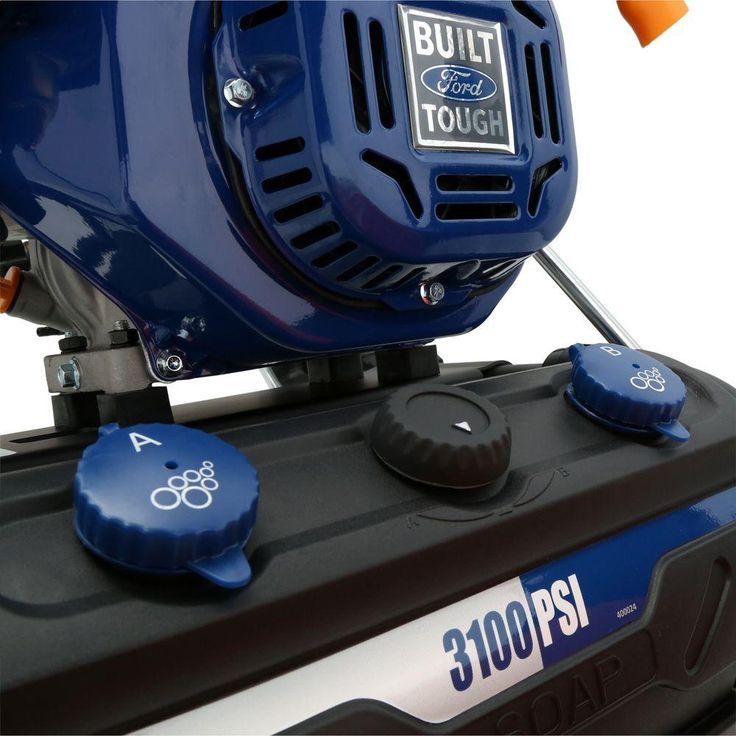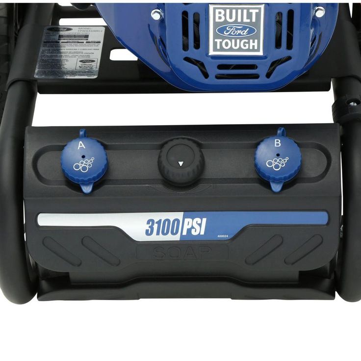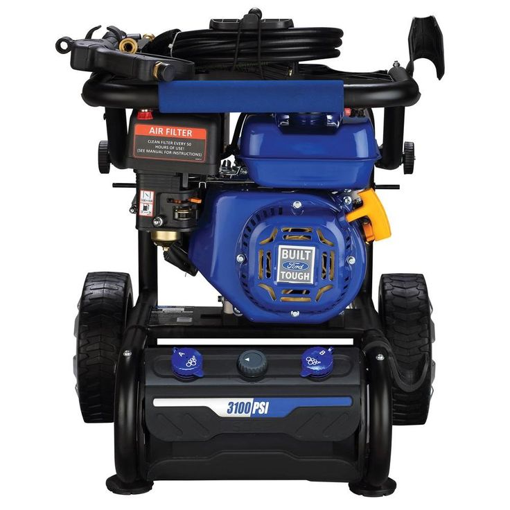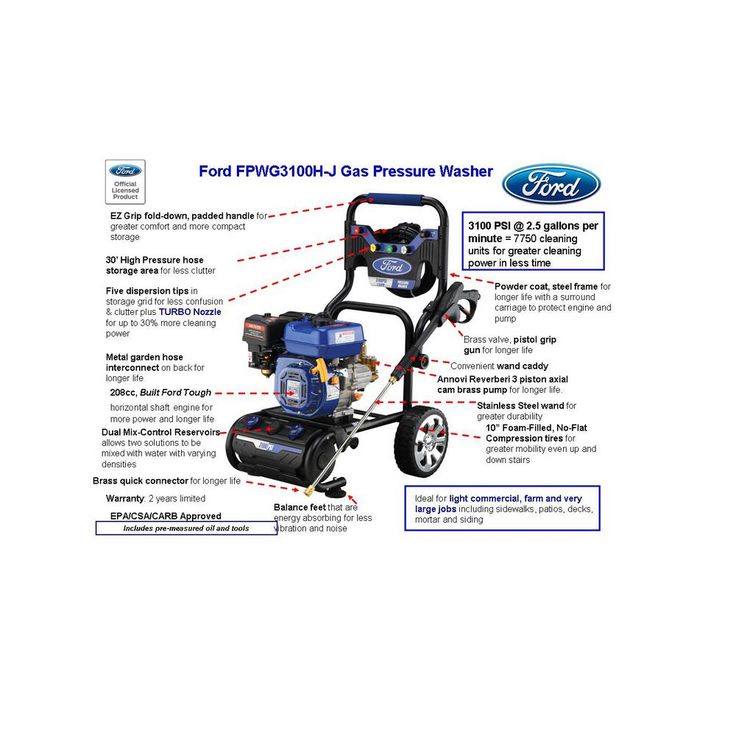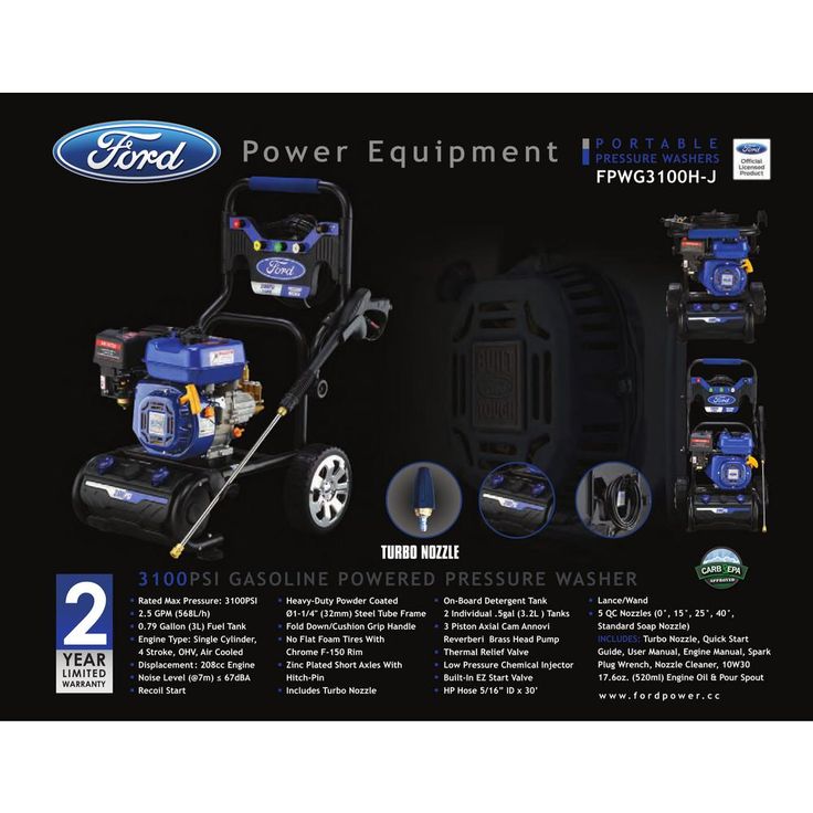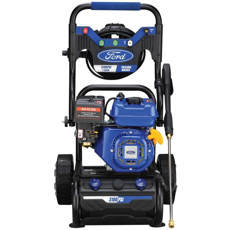 Ford pressure washers are Built Ford Tough to provide years of quality cleaning service. The 3,100 psi, high performance gasoline powered pressure washer integrates a 208cc, 7 HP OHV, horizontal shaft gasoline engine with a three-piston axial cam pump to create 3,100 psi at 2.5 GPM (Gallons Per Minute) for an incredible 7,750 cleaning units for quick jobs anywhere. The heavy duty 1-1/4 in. powder coated frame with foam grip handle ensures comfort and durability, while the over-sized, no-flat pneumatic wheels ensure allow movement over virtually any surface and even up flights of stairs. The Ford 3100H includes a stainless steel wand, 30 ft. braided high pressure hose and four independent quick-connect dispersion 0°, 15°, 25°, 40° dispersion tips and a specialized chemical tip as well. The four different Quick-Connect tips are made to attach and remove easily and are designed with different dispersion angles for pre-defined spraying patterns. The 0° nozzle allows for blasting caked on mud from heavy duty equipment and removing rust from steel. The 15° nozzle removes paint from wood, masonry or metal. The 25° nozzle is designed for general cleaning of roofs, gutters and light stains. The 40° nozzle is designed for light washing/rinsing of roofs, windows, walls, patios and driveways. The chemical dispensing nozzle provides a constant stream of chemicals from a unique dual well chemical reservoir.