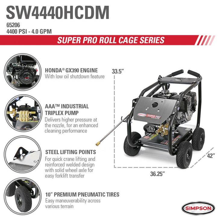 Built for the tough jobs, The Simpson Super Pro Roll Cage will handle all your commercial needs. The options are endless with models sporting direct, belt or gear drives premium AAA or COMET pumps. The remote unloader with bypass hose provides industrial durability for extended pump life. Pull up to the work area, connect the spray gun, start the engine and begin cleaning.