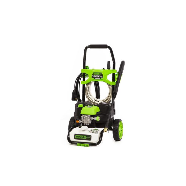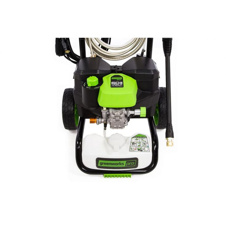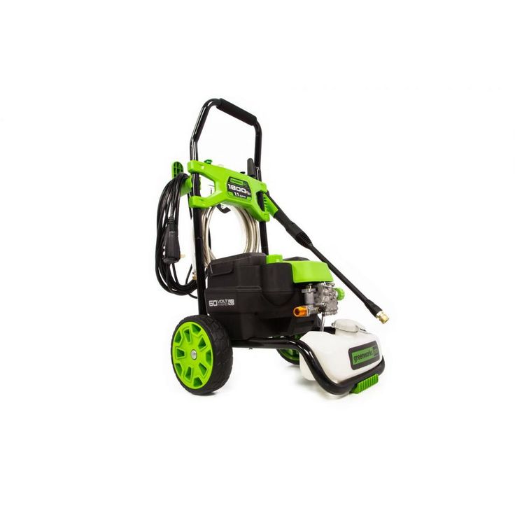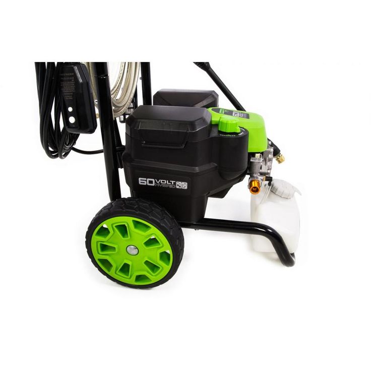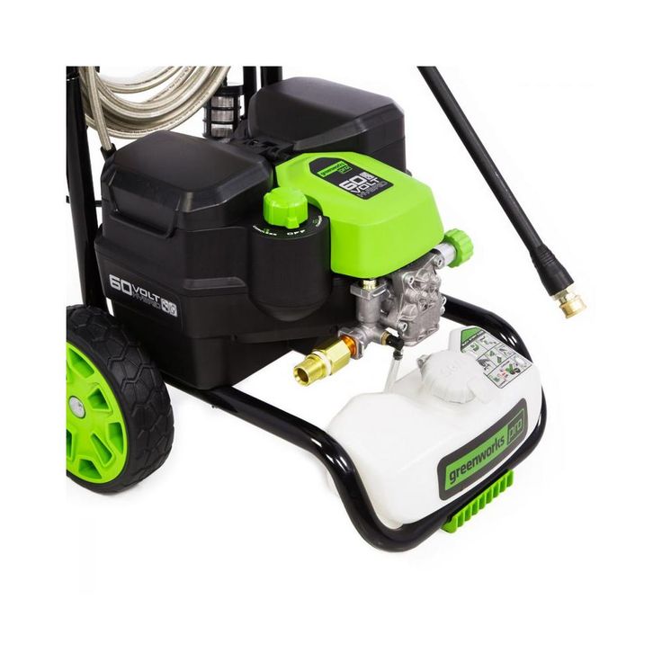 The all-new Greenworks PW18HYB hybrid pressure washer offers the ultimate in portability - it runs on a standard household AC 120-Volt electrical outlet OR 2 pro-grade 60-Volt lithium-ion batteries. When powered by AC, this powerful, reliable pressure washer delivers 1,800 maximum psi of cleaning pressure at 1.1 GPM of water flow, while battery-power delivers 1,500 psi at 1.0 GPM. Battery power and siphon-capabilities make it perfect for cleaning all those spots where AC hookups and hose bibs are not available, like boats, campers, and work areas. This lightweight, compact, easy-to-store pressure washer features a rugged metal design and durable aluminum pump head with stainless steel pistons for long life. With a 20 ft. PVC hose, self-siphoning hose, onboard soap tank with built-in detergent system, and on-board a ccessory storage with 25° and 40° nozzles, turbo nozzle, and soap nozzle tips, it's versatile, portable, and powerful for handling the most stubborn cleaning tasks. Backed by a 3-year limited tool warranty. Batteries sold separately.