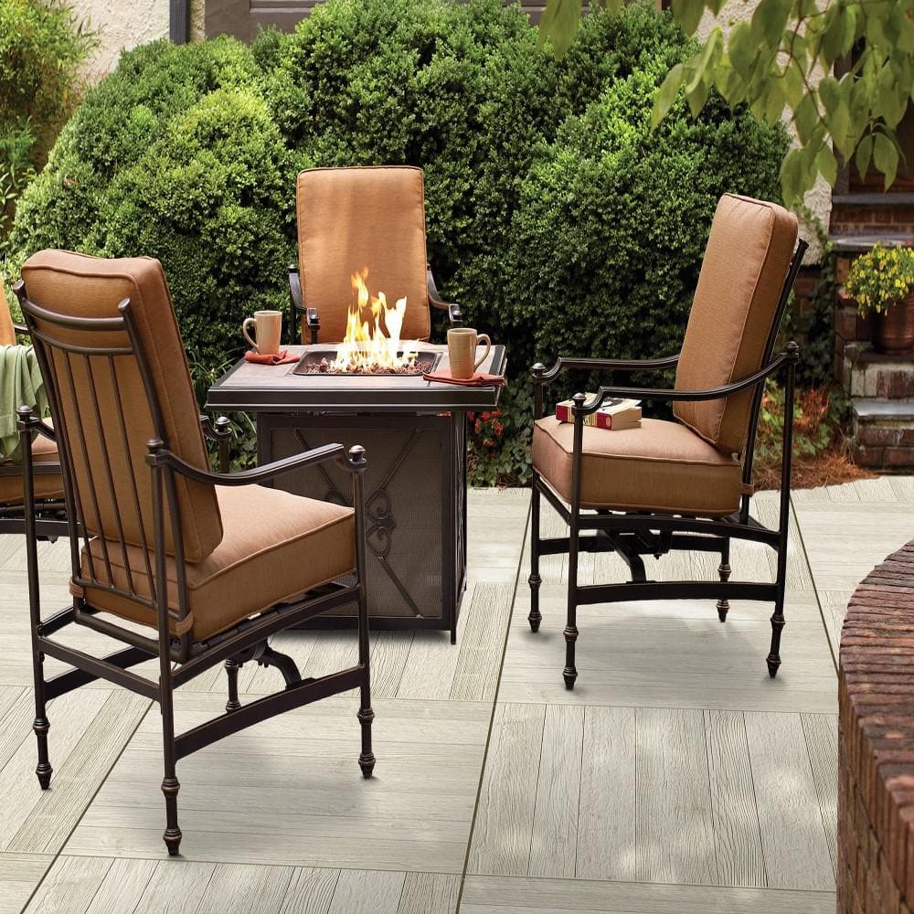 A: Yes, porcelain resists water and staining for poolside use and handles typical patio heat exposure; follow local codes and installer guidance around open flames.