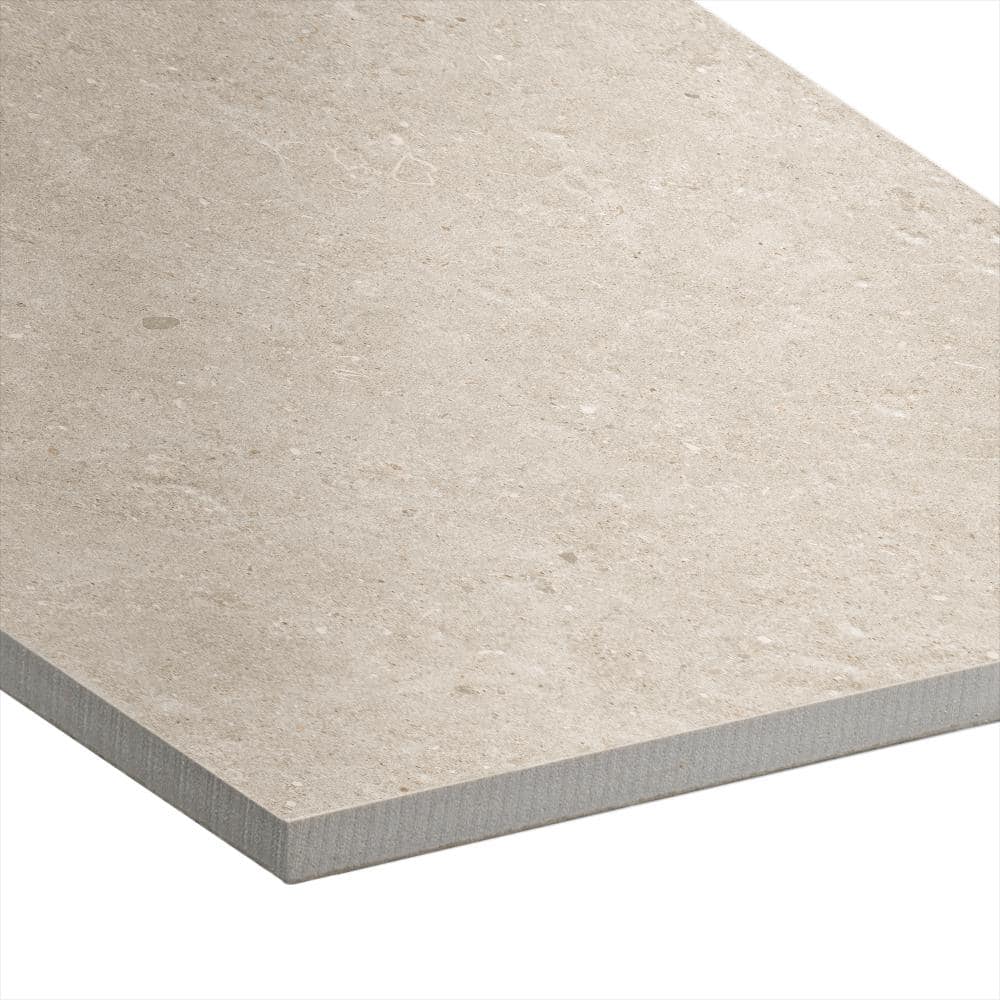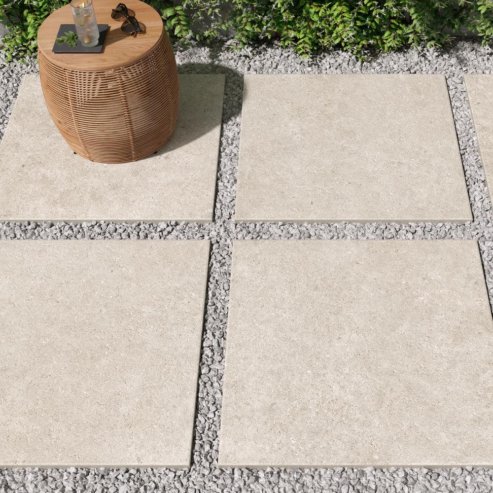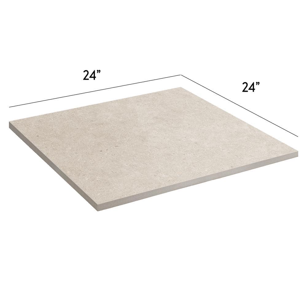 Outdoor-rated porcelain pavers with a refined limestone-look in a soft white tone. Each 24x24 tile is 0.75 in. thick for strength and durability, ideal for patios, walkways, and pool decks.