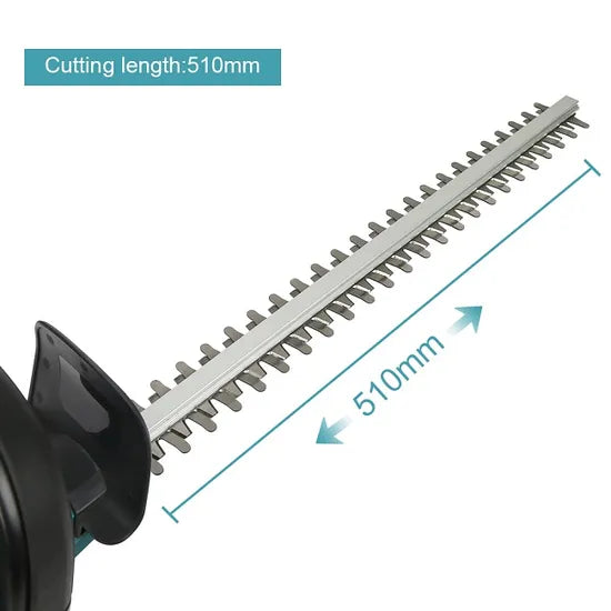 A: It features a cutting length of 510mm, enabling effective trimming of large hedges.