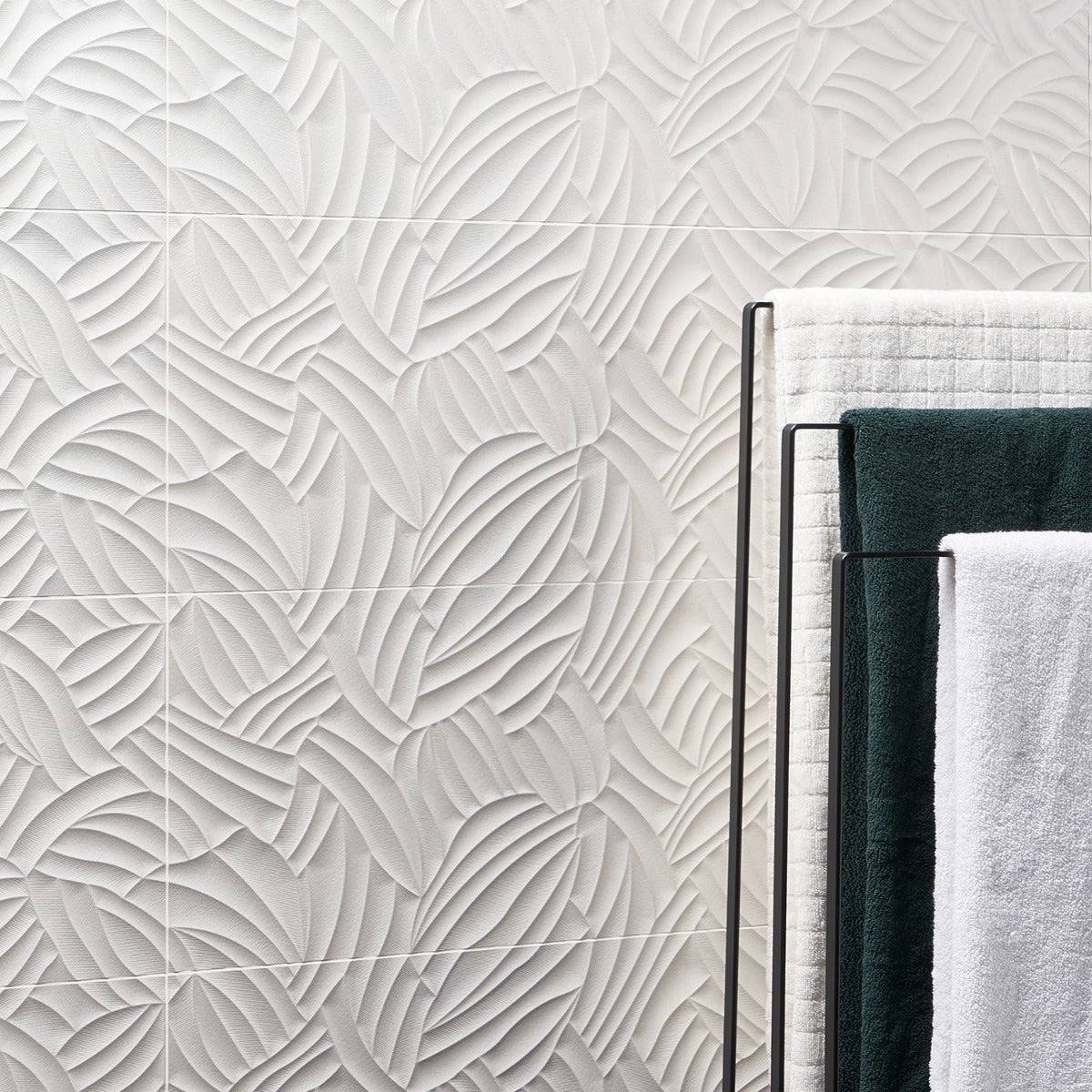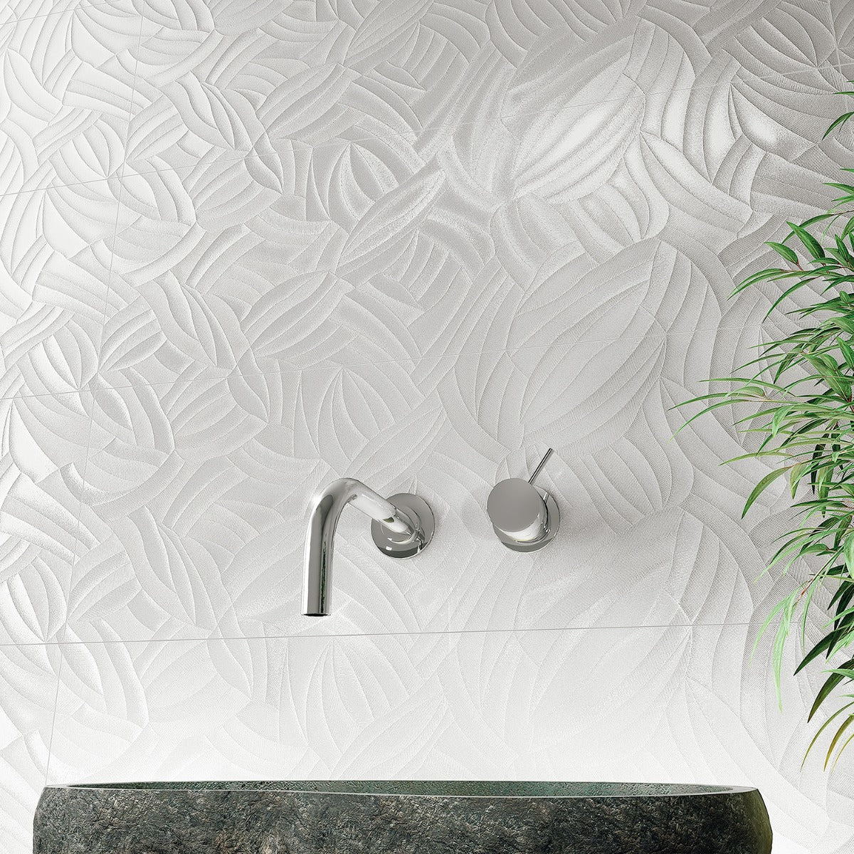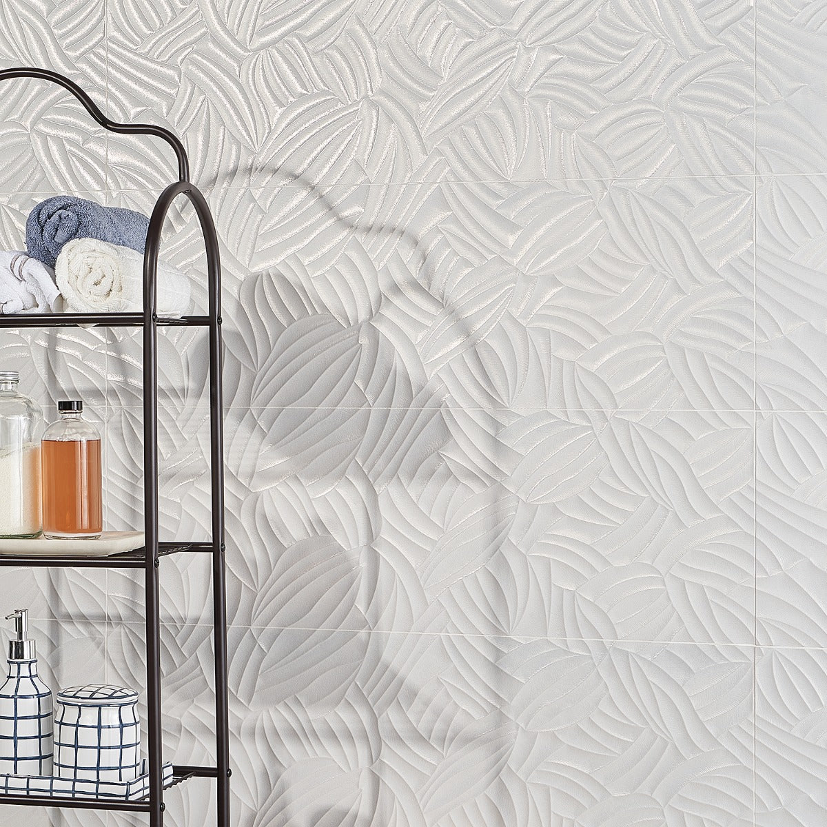 The Wonderland Garden White Tile features a stunning 3D leaf design with a polished finish, perfect for creating elegant and modern wall spaces. Made in Spain, this large-format tile reduces grout joints and adds a sophisticated touch to any room.