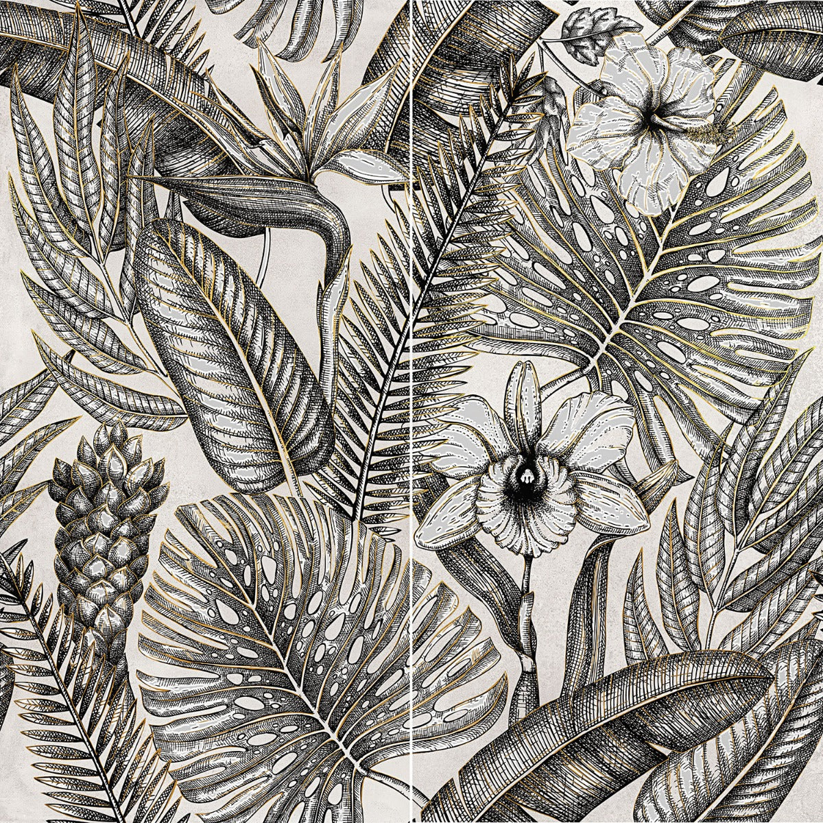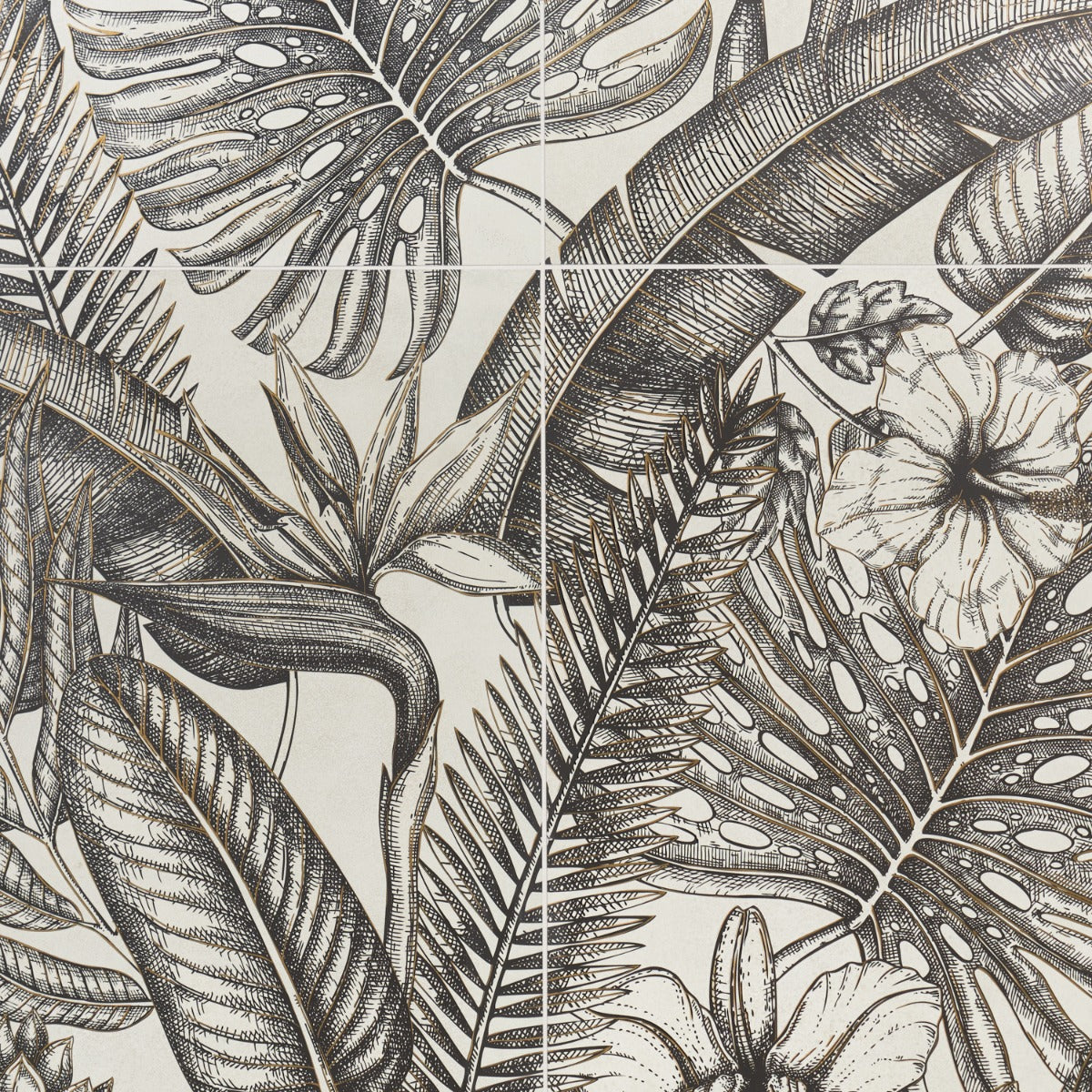 The Gardenia Black and White Porcelain Tile by Paula Purroy features intricate botanical designs with gold accents, offering a unique and artistic touch to any space. Its large format and rectified edges ensure a seamless and elegant installation.