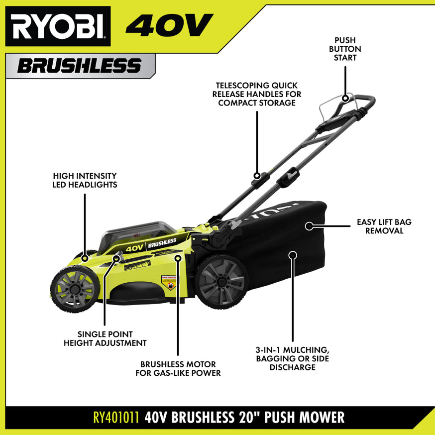 Upgrade to quiet, efficient lawn care—add the RYOBI 40V Brushless 20" Push Mower to your cart today.