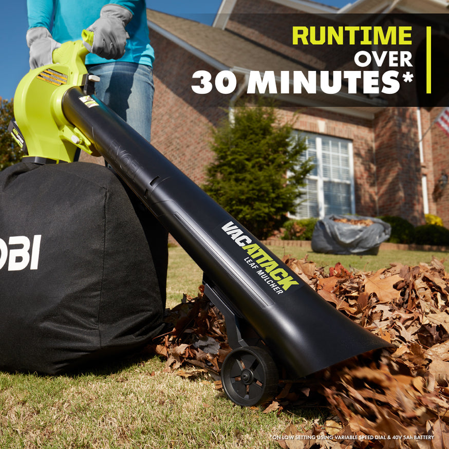 Tackle yard cleanup with the RYOBI 40V Leaf Vacuum/Mulcher. This cordless VacAttack unit features a durable metal impeller, variable speed control, and a heavy-duty collection bag to quickly vacuum and mulch leaves without cords or gas.