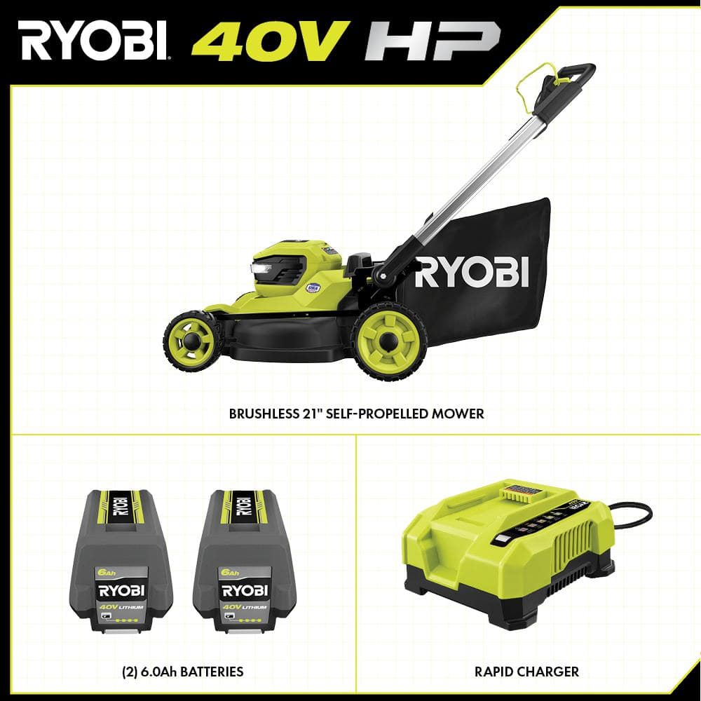 RYOBI 40V HP Brushless 21 in. Cordless Battery Walk Behind Self-Propelled Lawn Mower with (2) 6.0 Ah Batteries and Charger