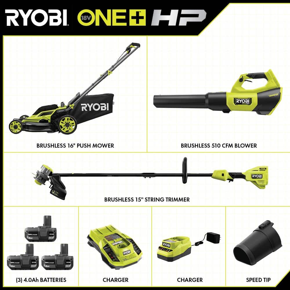 RYOBI ONE+ HP 18V Brushless 16 in. Cordless Battery Push Lawn Mower, String Trimmer & Blower w/(3) Batteries & (2) Chargers