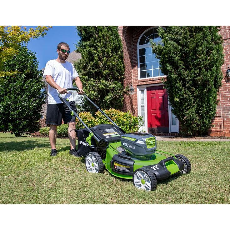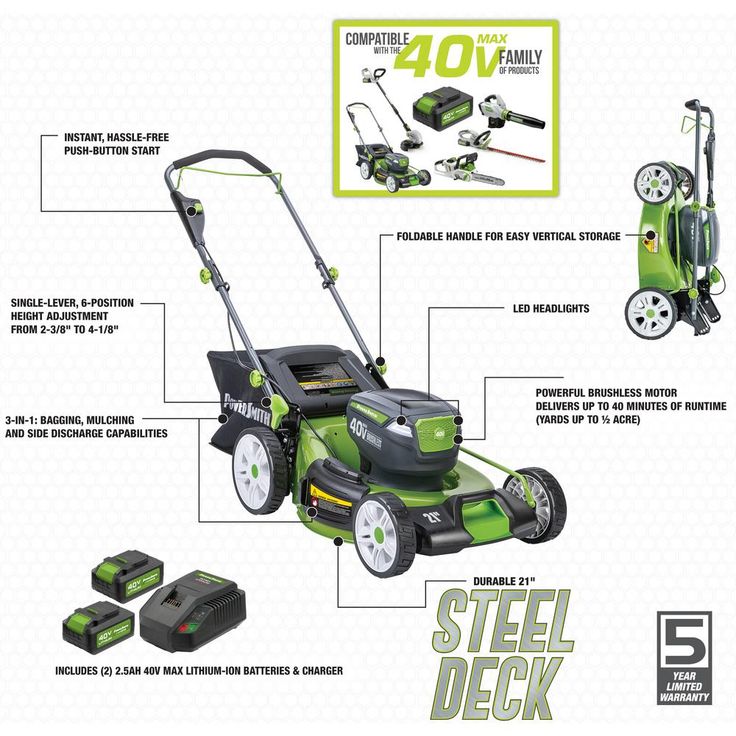 The PowerSmith PLM14021H 21 in. 40-Volt Maximum Lithium-ion lawn mower delivers the power and convenience you've been looking for. Featuring a brushless motor with a 21 in. steel deck and two 40-Volt 2.5 Ah batteries, it is capable of handling lawns up to a 1/2 acre. Push-button start, single lever height adjustment, a foldable handle and even LED headlights make it easy to use.