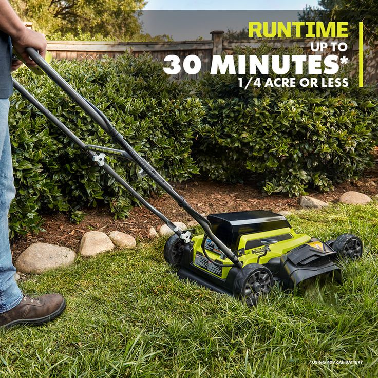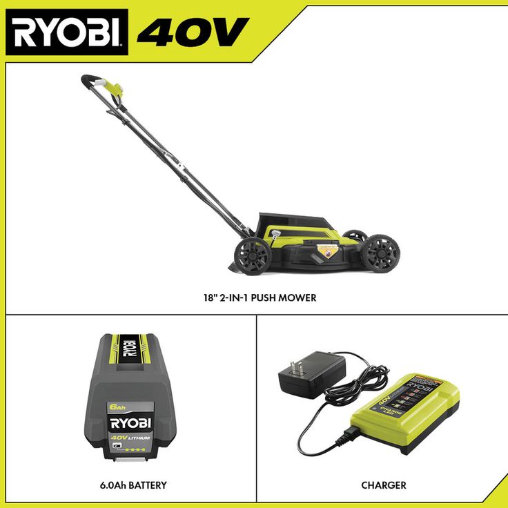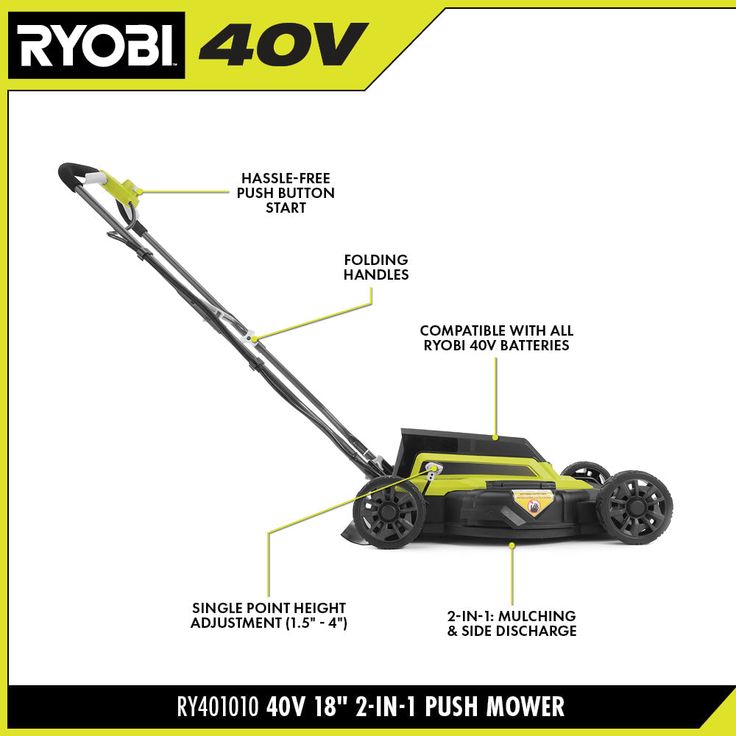 RYOBI continues to simplify yard work with the introduction of the 40-Volt Lithium-Ion 18 in. 2-in-1 Cordless Lawn Mower. Powered by a 40-Volt 4 AH Lithium-Ion Battery you can start mowing with the push of a button, instead of having to hassle with extension cords or mixing gas and oil. Select your ideal grass height from 1.5 in. to 4 in. with the 7-position single point height adjustment. The 2-in-1 mulching and side discharge options let you choose which mowing function is best for your yard. Release the mulch door before mowing to fertilize your lawn with clippings or insert the side discharge chute to discharge your clippings to the side. The compact design features a sleek 18 in. deck, and collapsible handles, making it ideal for storage in tight spaces. This mower and the included battery are compatible with all RYOBI 40V tools, batteries and chargers. Backed by a 5-year Limited Warranty.
