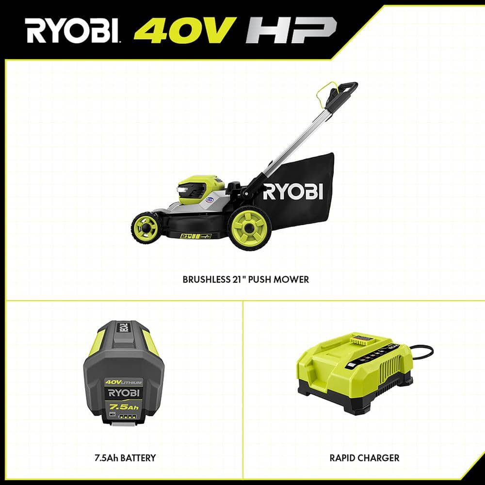 RYOBI 40V HP Brushless 21 in. Battery Walk Behind Multi-Blade Push Lawn Mower with 7.5 Ah Battery and Rapid Charger
