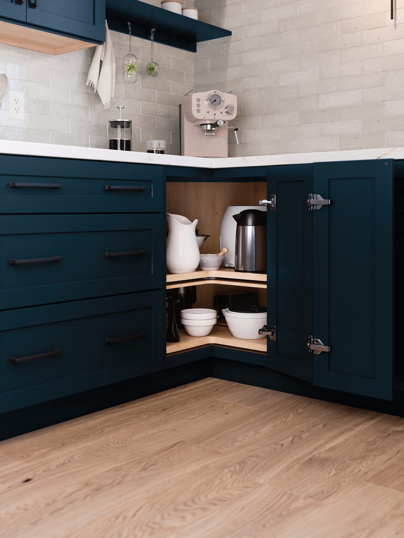 • Functionality: Lazy Susan configuration enhances accessibility and efficiency in corner spaces.
