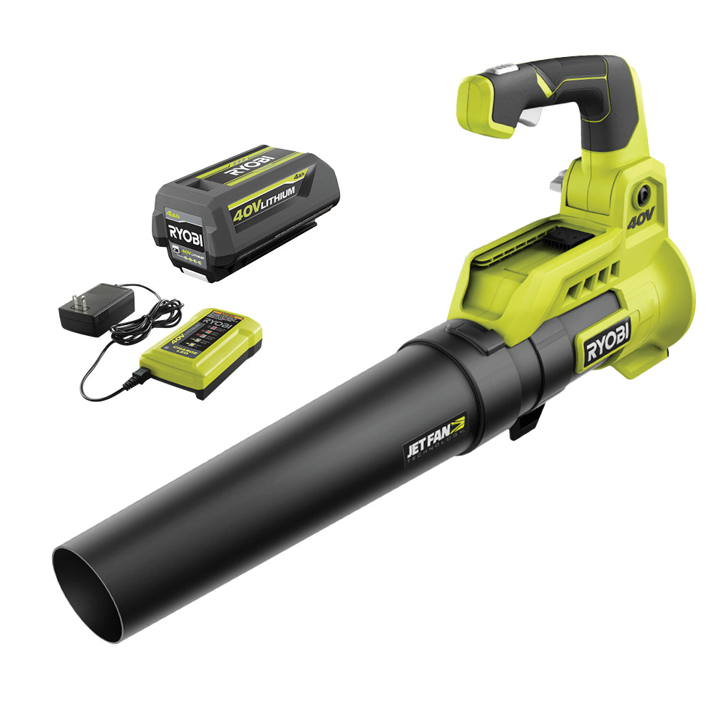 RYOBI 40V Jet Fan Leaf Blower Kit, 110 MPH, 525 CFM with Lawn & Leaf Bag, 4.0 Ah Battery and Charger