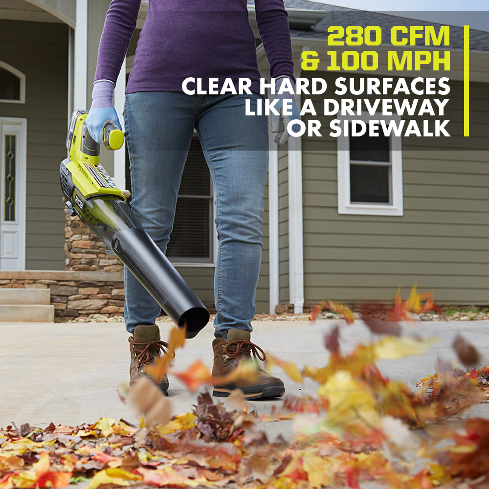 Clear driveways and sidewalks fast with this compact 18V ONE+ jet fan blower delivering up to 280 CFM and 100 MPH. The lightweight design and variable speed trigger offer easy control for everyday yard cleanup.