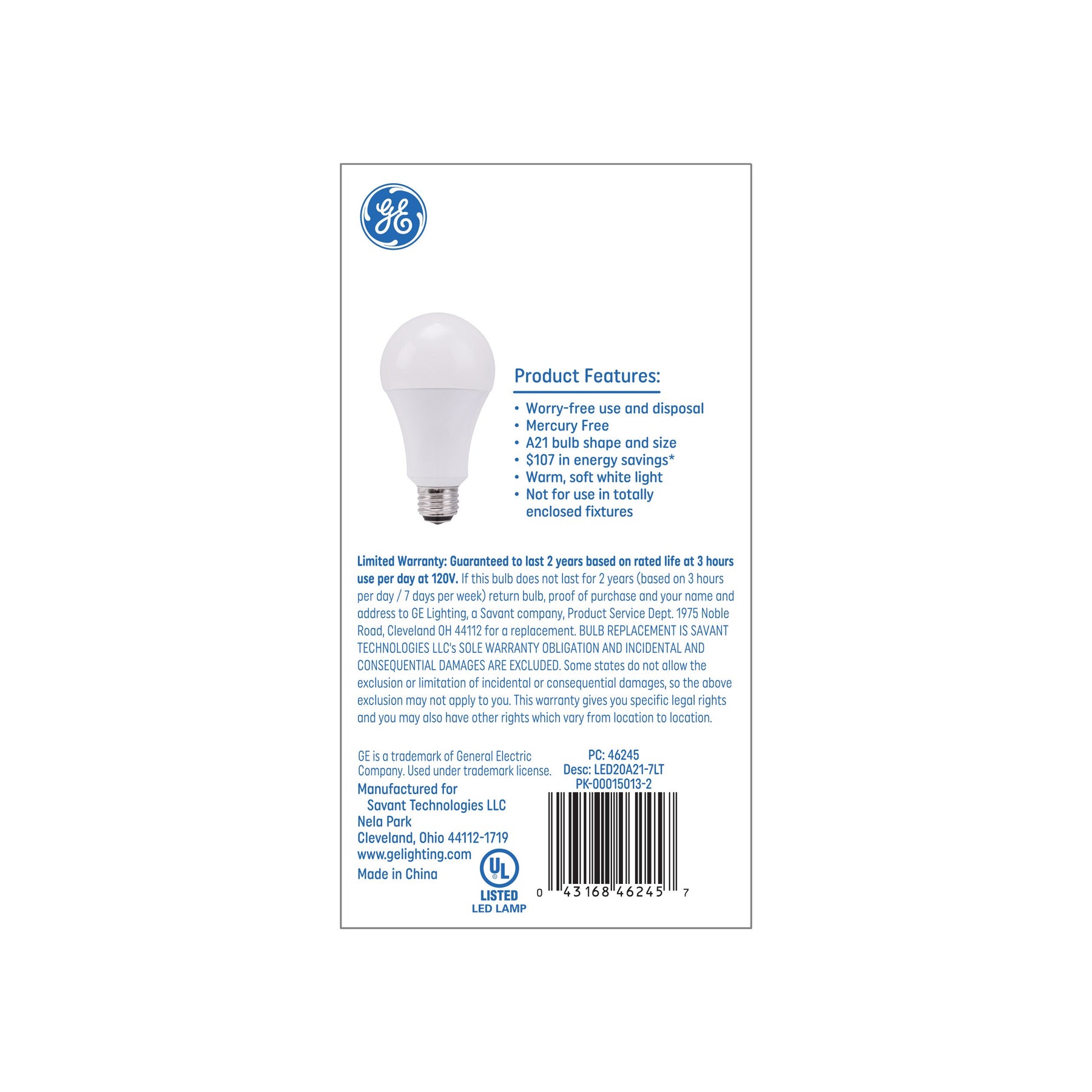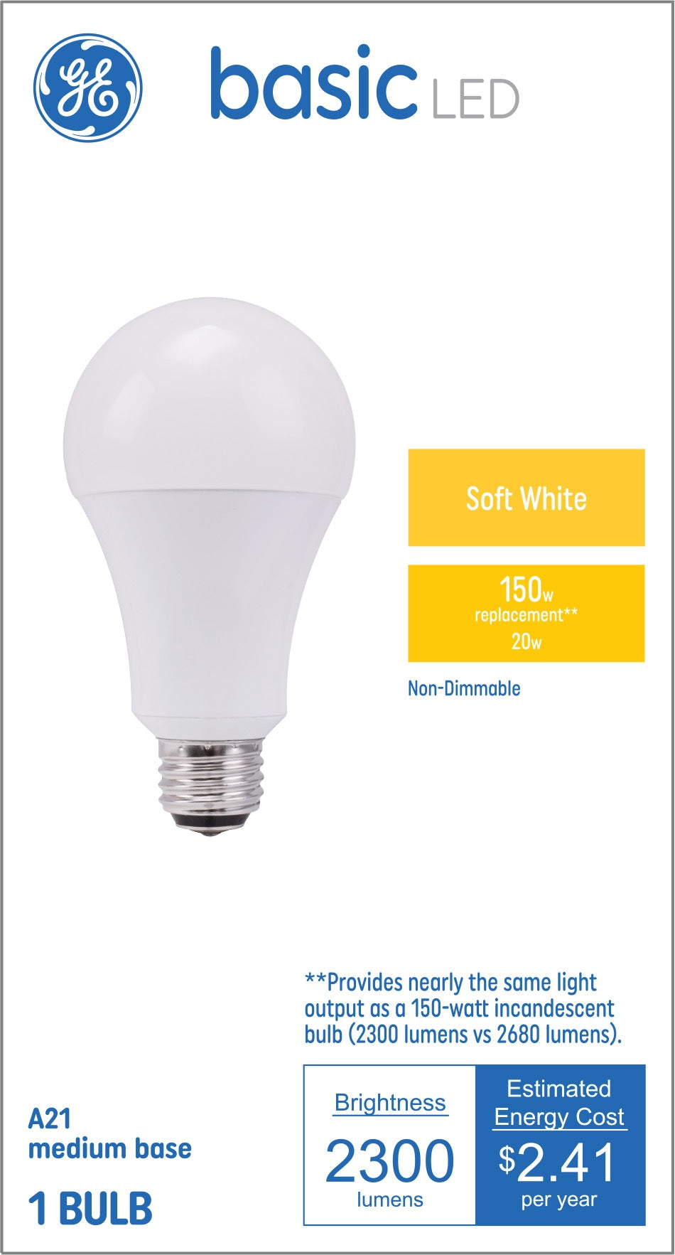 Upgrade to efficient, warm light with the GE Basic A21 LED bulb. Delivering 2300 lumens at just 20 watts, it replaces a 150W incandescent for general-purpose indoor fixtures with a soft 2700K glow.