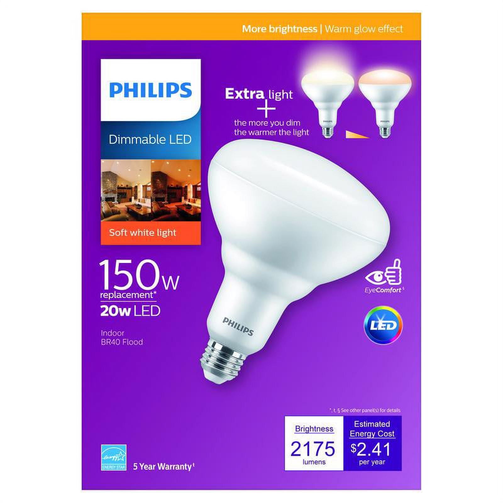 Upgrade recessed and flood lighting with Philips BR40 LED bulbs that deliver 150W-equivalent brightness using just 20W. The Warm Glow dimming effect gets warmer as you dim for cozy ambience, while Soft White 2700K light and EyeComfort design make them ideal for living spaces.