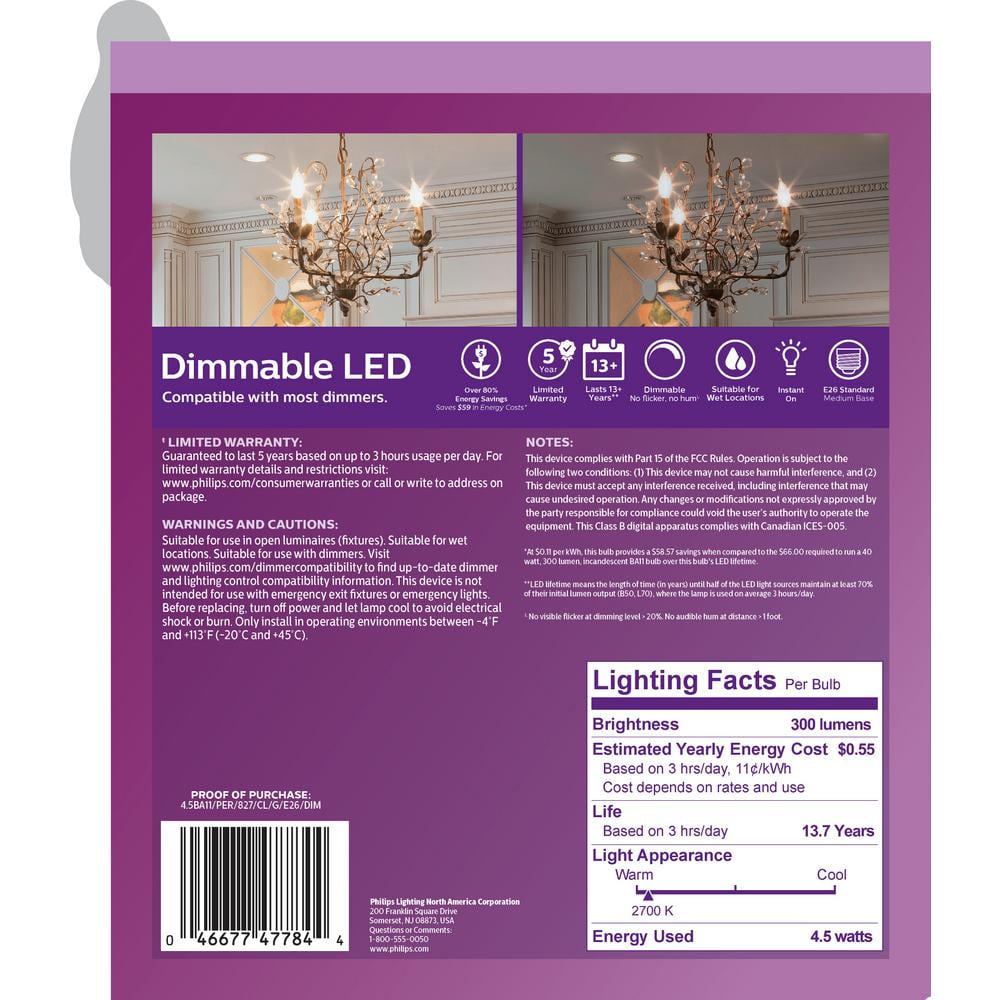 Illuminate chandeliers and decorative fixtures with Philips B11 dimmable LED candle bulbs. The glass bent-tip design delivers crisp 5000K daylight while using low energy and fitting standard candelabra sockets for easy upgrades.