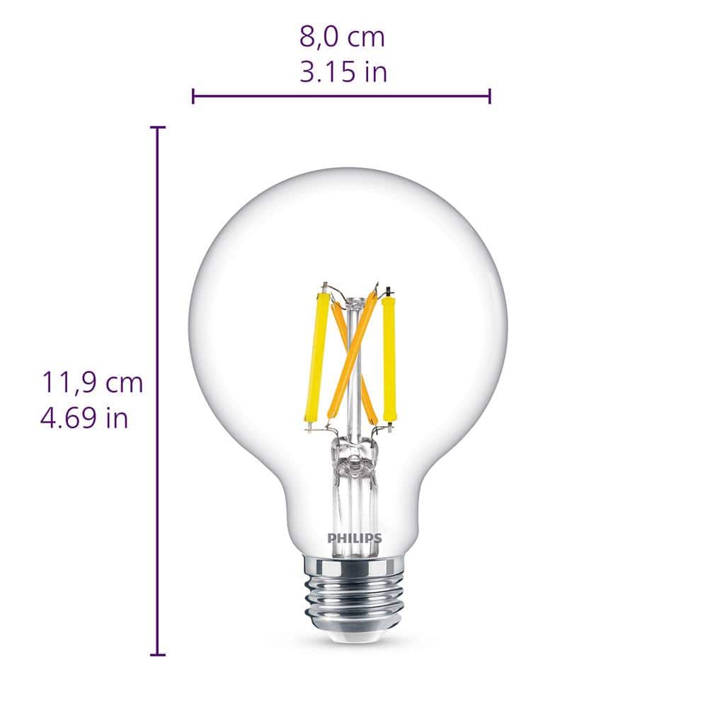 Bring cozy, high-definition light to vanities and open fixtures with these Philips G25 LED bulbs. The clear glass, filament-style LEDs deliver 350 lumens of soft white 2700K light and dim smoothly to a warm glow while saving energy versus 40W incandescent bulbs.