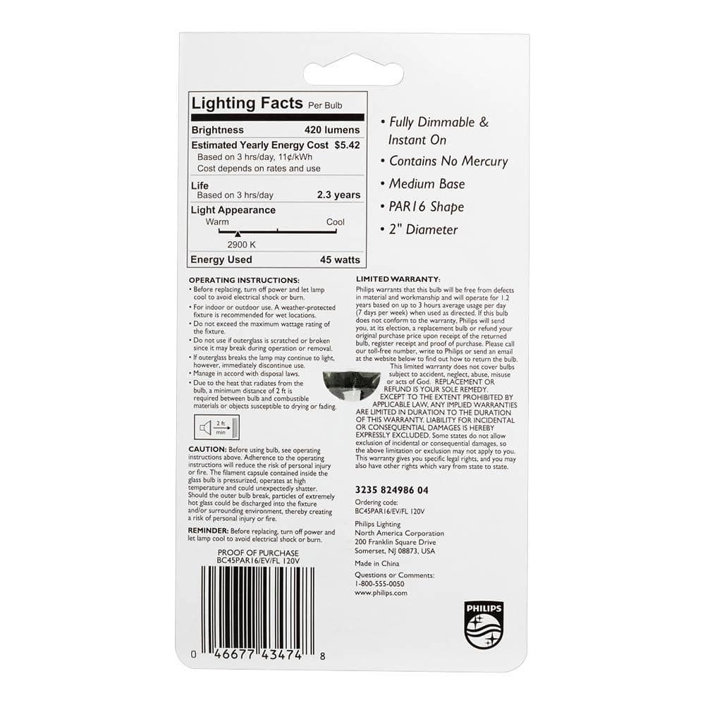 Philips 45-Watt Equivalent PAR16 Halogen Dimmable Flood Light Bulb, Medium E26 Base, 420 Lumens