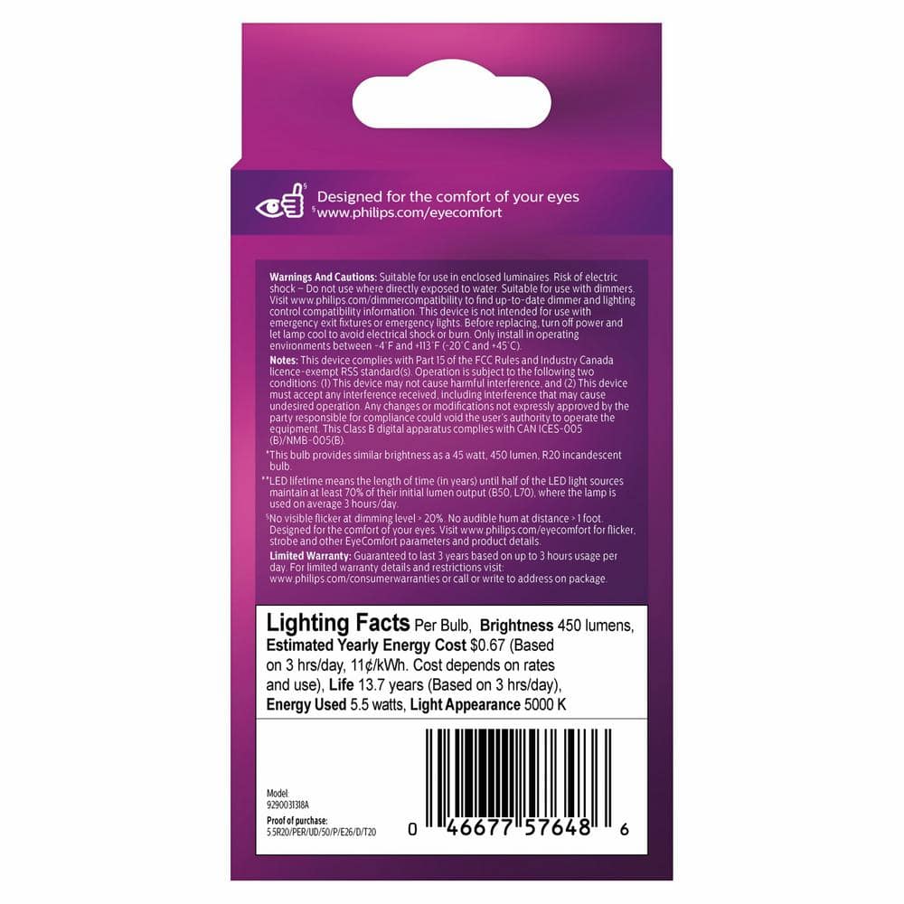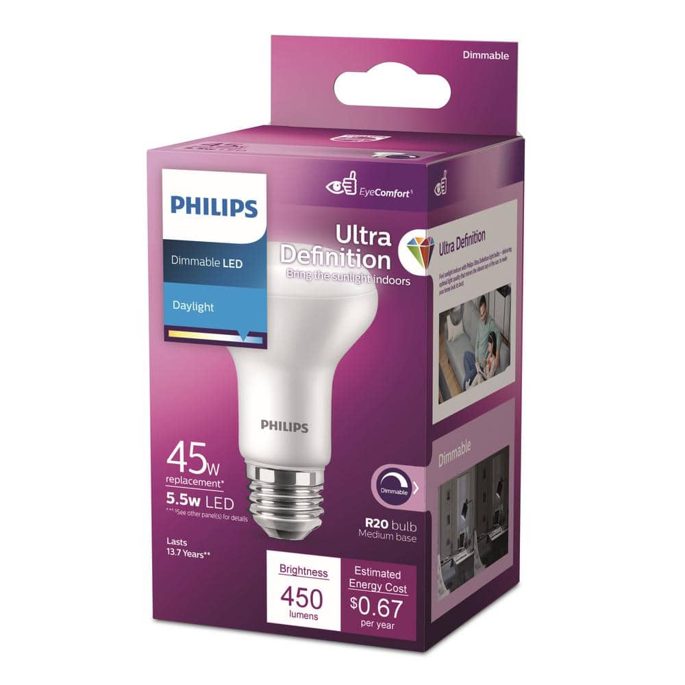 Brighten recessed and track lighting with Philips R20 dimmable LED flood bulbs. Delivering crisp 5000K daylight at 450 lumens while using just 5.5W, these medium-base LEDs offer long-lasting, comfortable light for everyday spaces.
