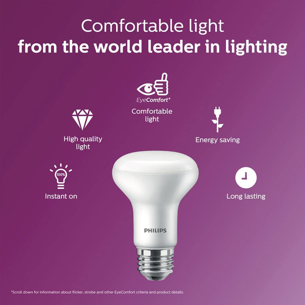 Create cozy, dimmable ambience with Philips R20 LED bulbs that warm from 2700K down to a candle-like glow as you dim. These ENERGY STAR bulbs deliver 450 lumens using just about 5–6 watts, ideal for recessed cans and track lighting with an E26 base.