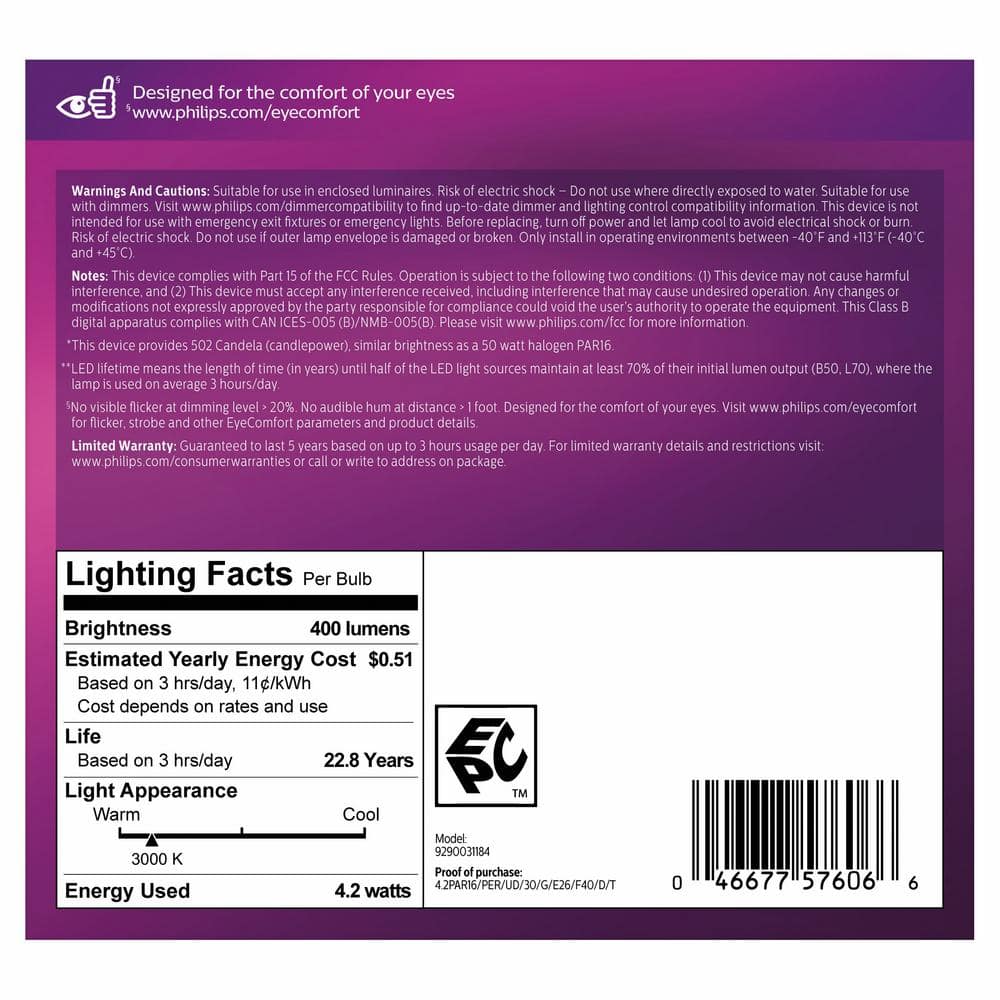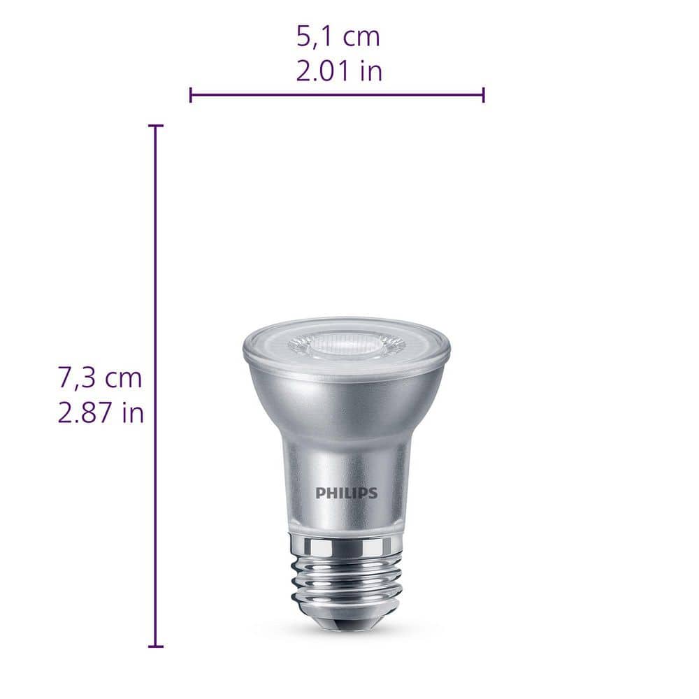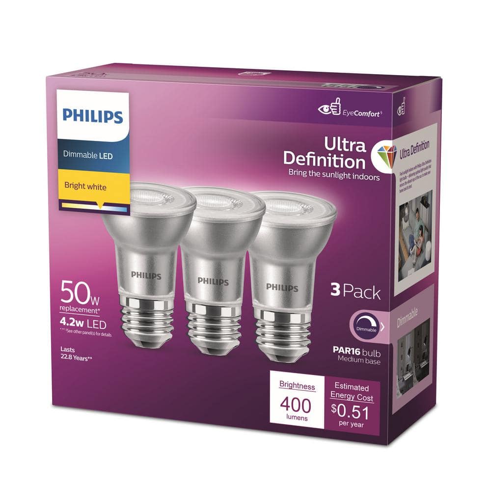 Upgrade to crisp, bright-white lighting with Philips PAR16 dimmable LED bulbs. The familiar glass design delivers 400 lumens of eye-comfort light with high color accuracy, ideal for spot and task lighting. Energy-efficient and long-lasting for everyday use.