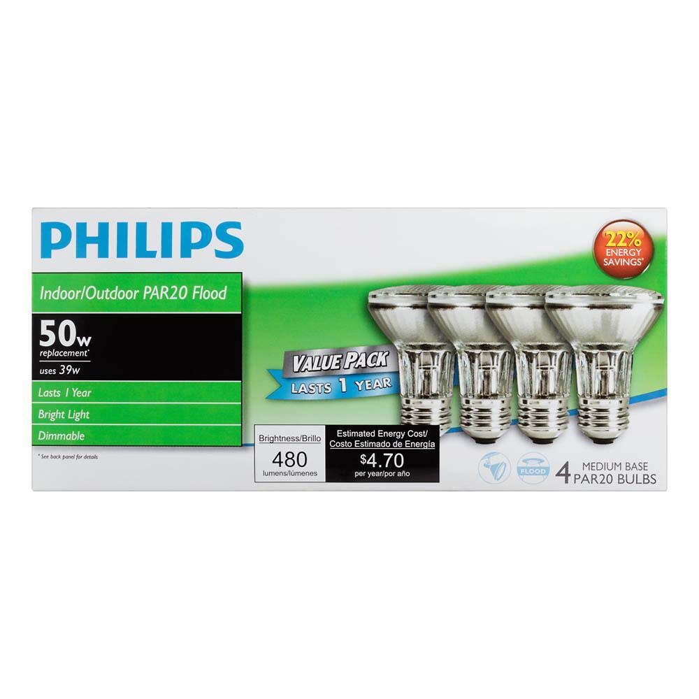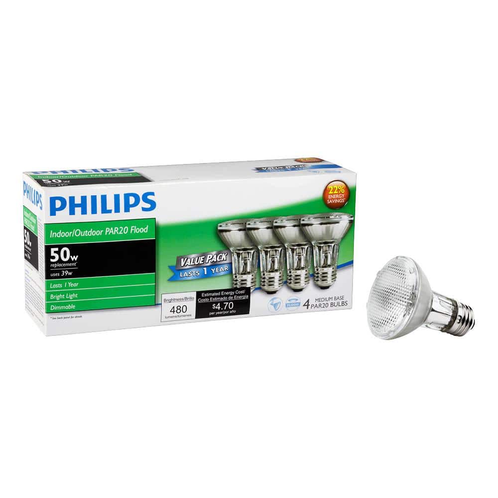 Reliable halogen PAR20 flood bulbs for indoor and outdoor fixtures, delivering bright, warm, dimmable light. Ideal for recessed cans and track lighting, these medium-base bulbs replace 50W incandescent while using 39W each.