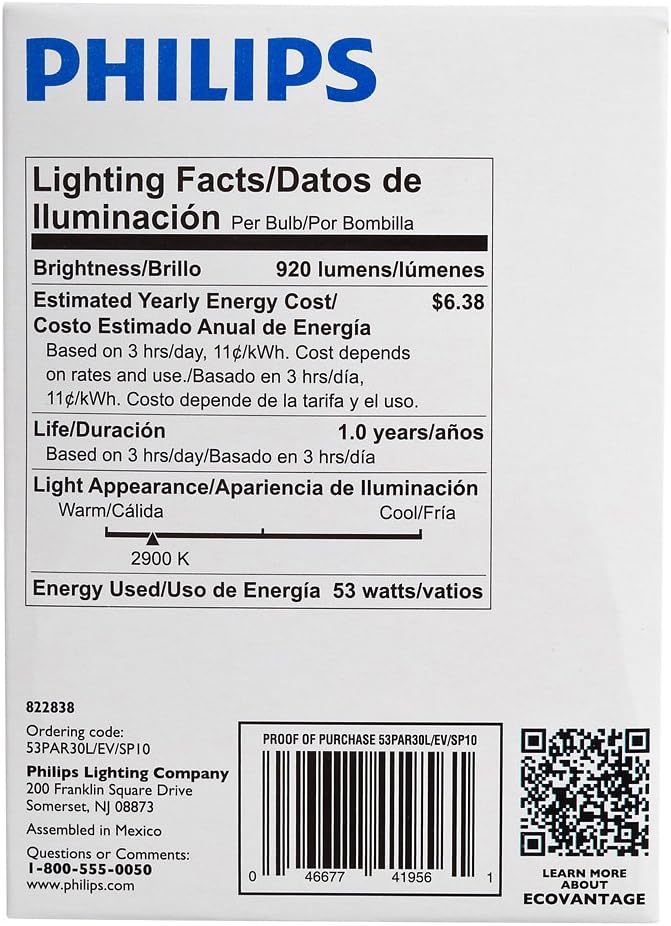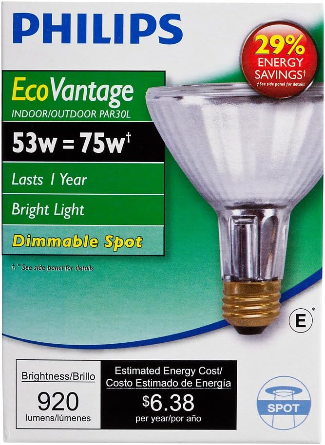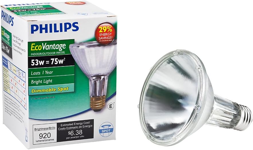 Bring bright, warm white accent lighting to indoor or outdoor fixtures with this Philips EcoVantage PAR30L halogen spotlight. Delivering 920 lumens with a tight 10° beam, it’s dimmable for ambiance control and fits standard E26 medium bases.