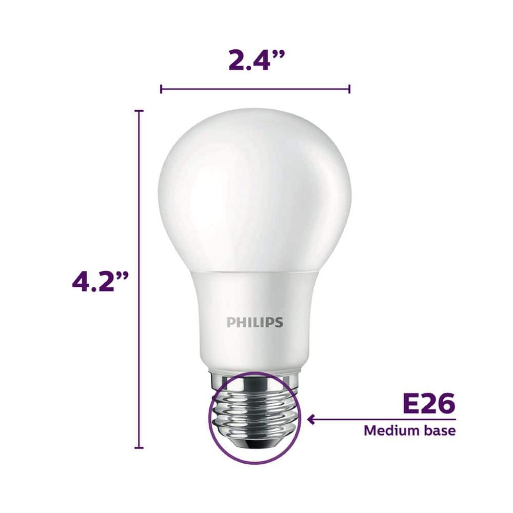 Upgrade to comfortable, energy-saving light with Philips A19 LED bulbs. These non-dimmable, frosted classic-glass lamps deliver 800 lumens of soft white (2700K) light while using only 10 watts and lasting up to 11,000–15,000 hours. Ideal for everyday indoor fixtures with a standard E26 medium base.