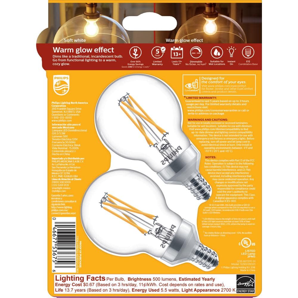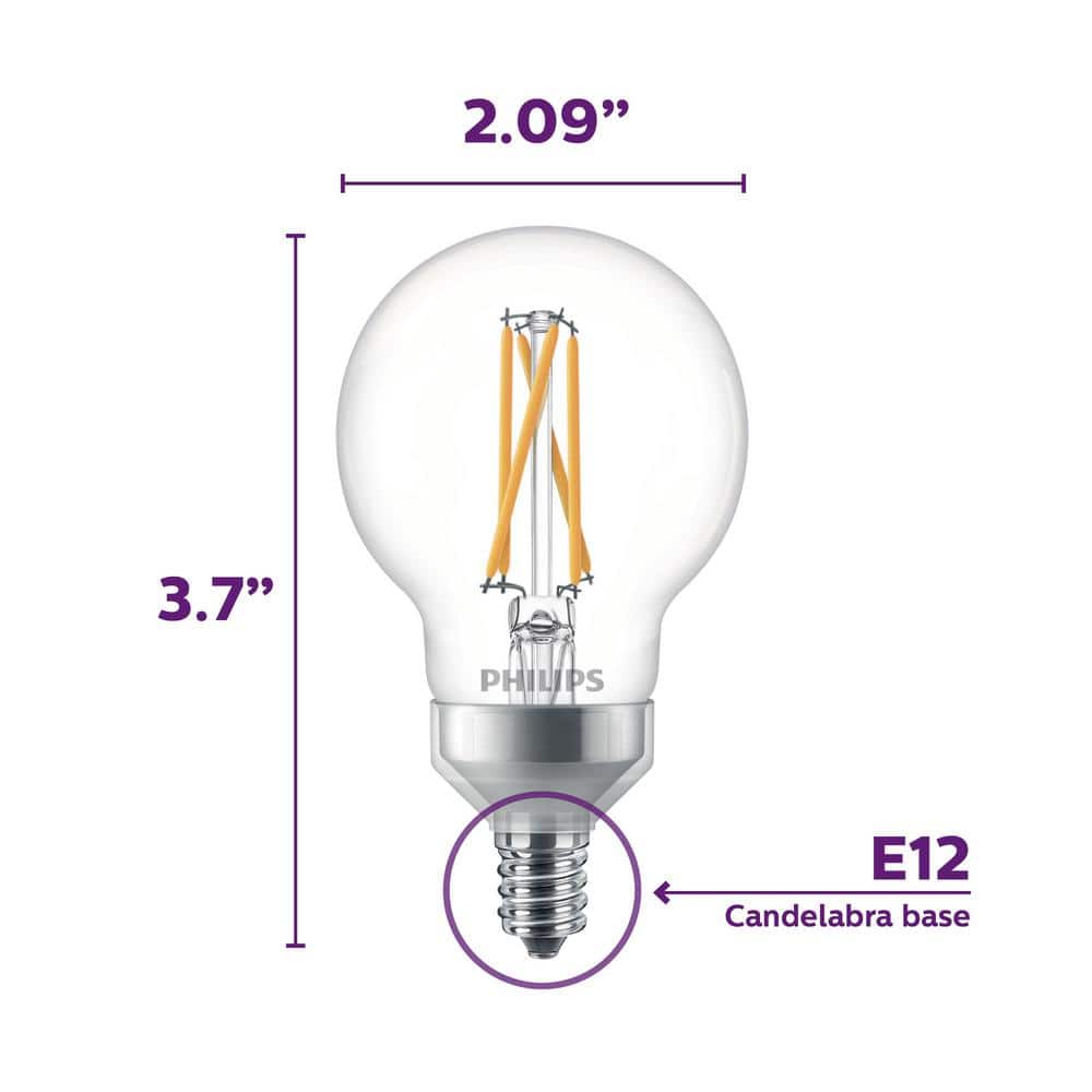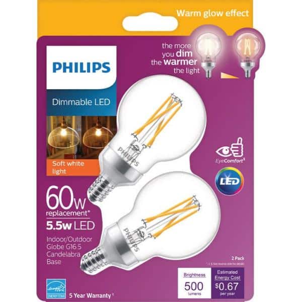 These Philips G16.5 LED bulbs deliver a 60W-equivalent soft white glow with Warm Glow dimming that gets warmer as you dim. The clear glass globe with E12 candelabra base provides 500 lumens of even light while using only 5.5W, ideal for decorative fixtures and chandeliers.