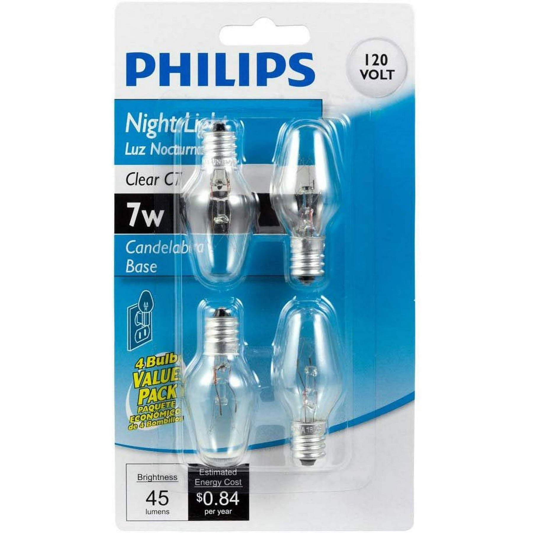 These Philips C7 incandescent bulbs are classic night-light replacements that deliver a soft, comfortable glow. Each 7-watt clear bulb with an E12 candelabra base fits standard night-light fixtures, providing dependable illumination for halls, bedrooms, and bathrooms.