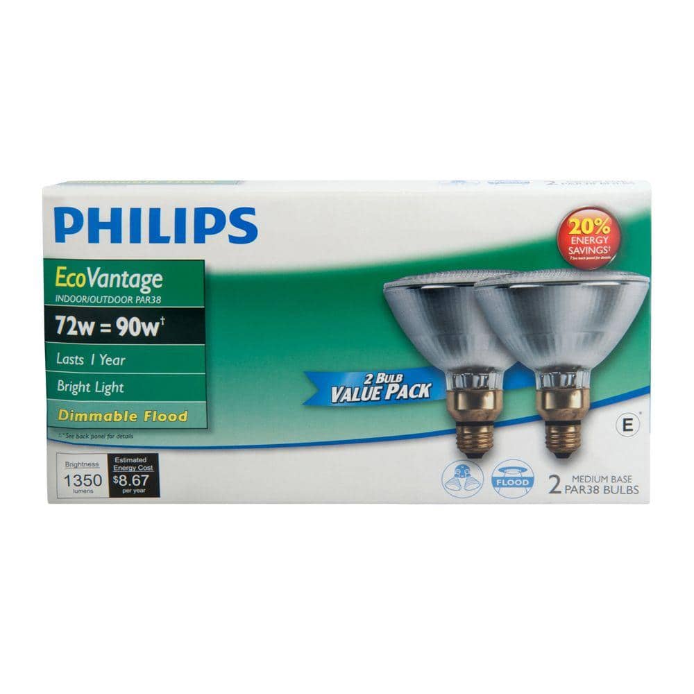 Bright, dimmable PAR38 halogen flood bulbs for indoor and outdoor fixtures. EcoVantage design delivers 1350 lumens with 72W energy use while replacing 90W incandescent performance. Ideal for security, accent, and general lighting.
