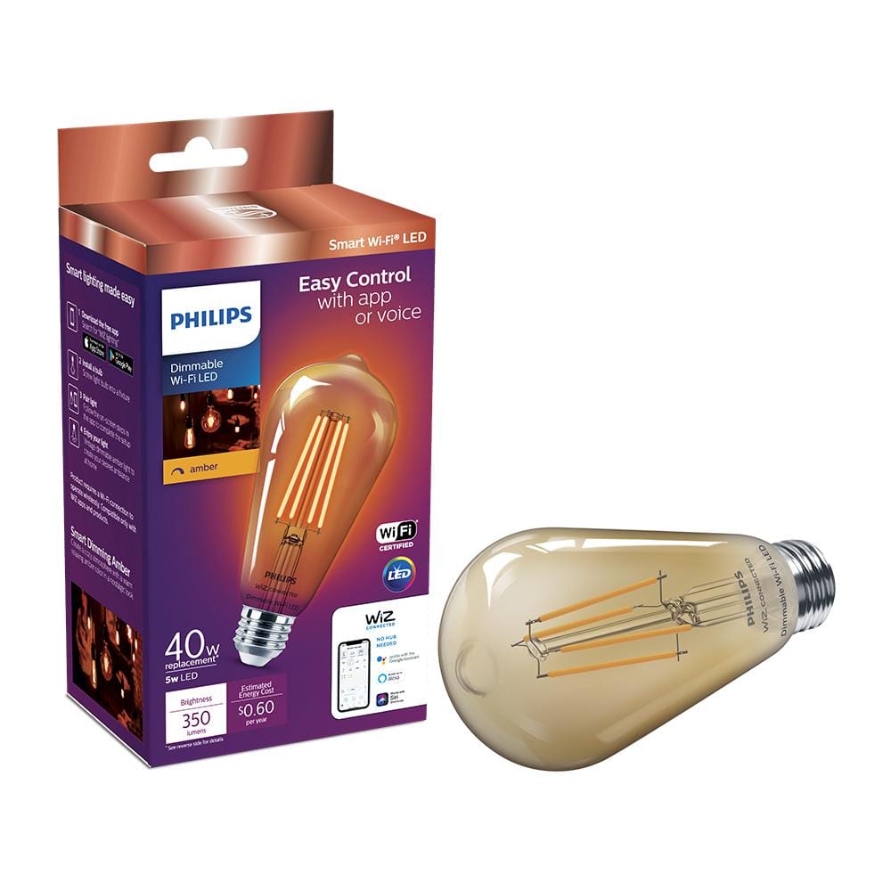 Bring vintage ambiance with modern control. This amber ST19 Edison-style LED delivers a cozy 2000K glow and connects via Wi‑Fi to the WiZ app for easy dimming, scheduling, and voice control—no hub required.